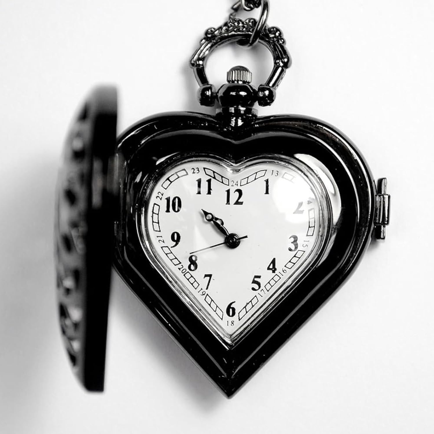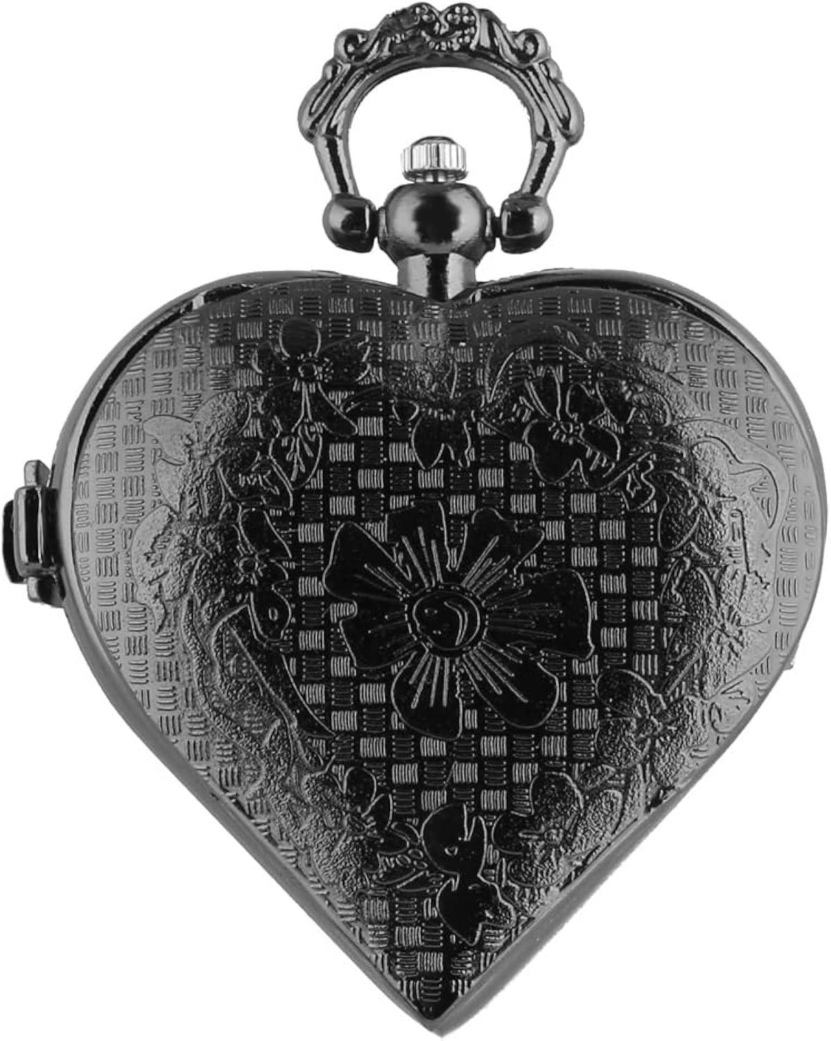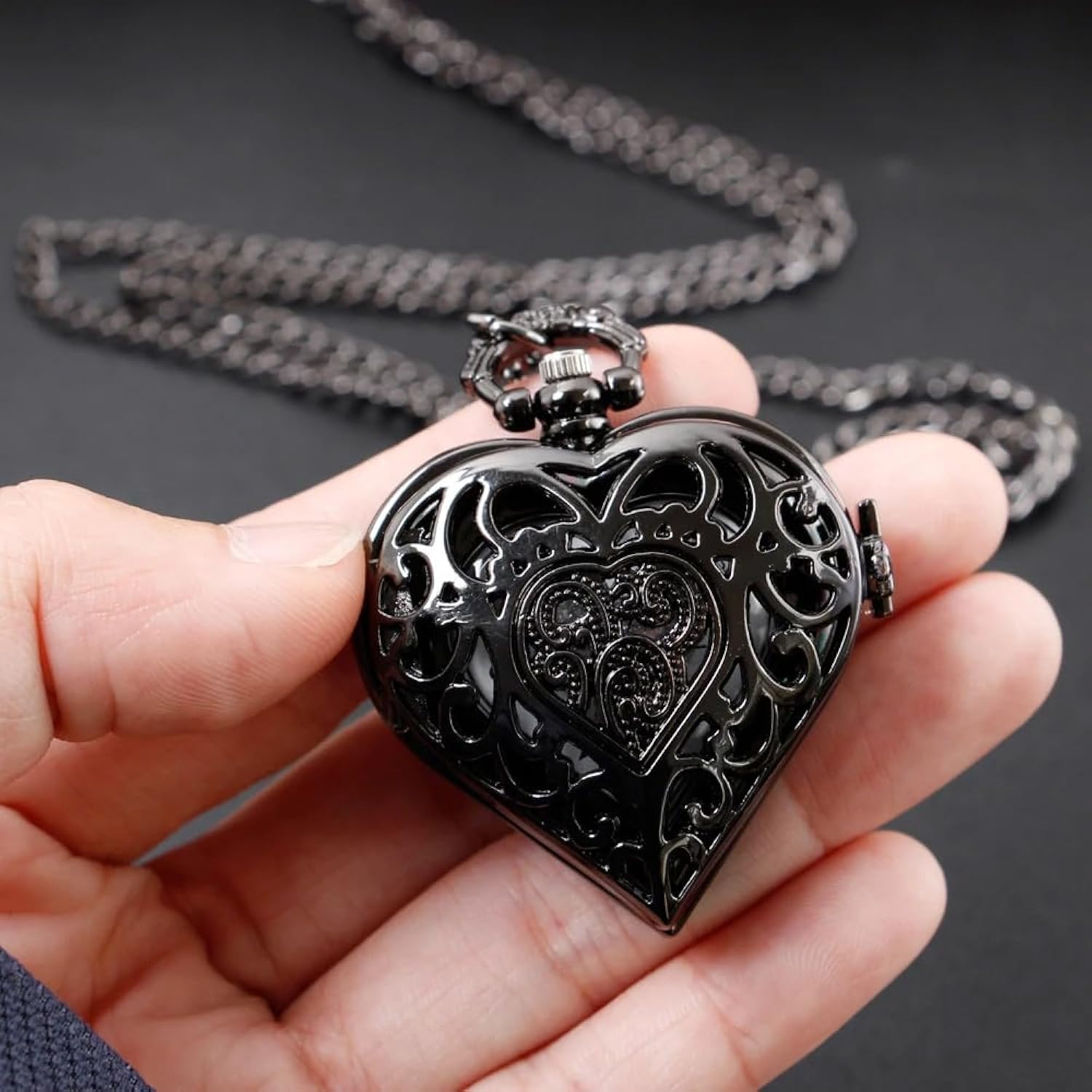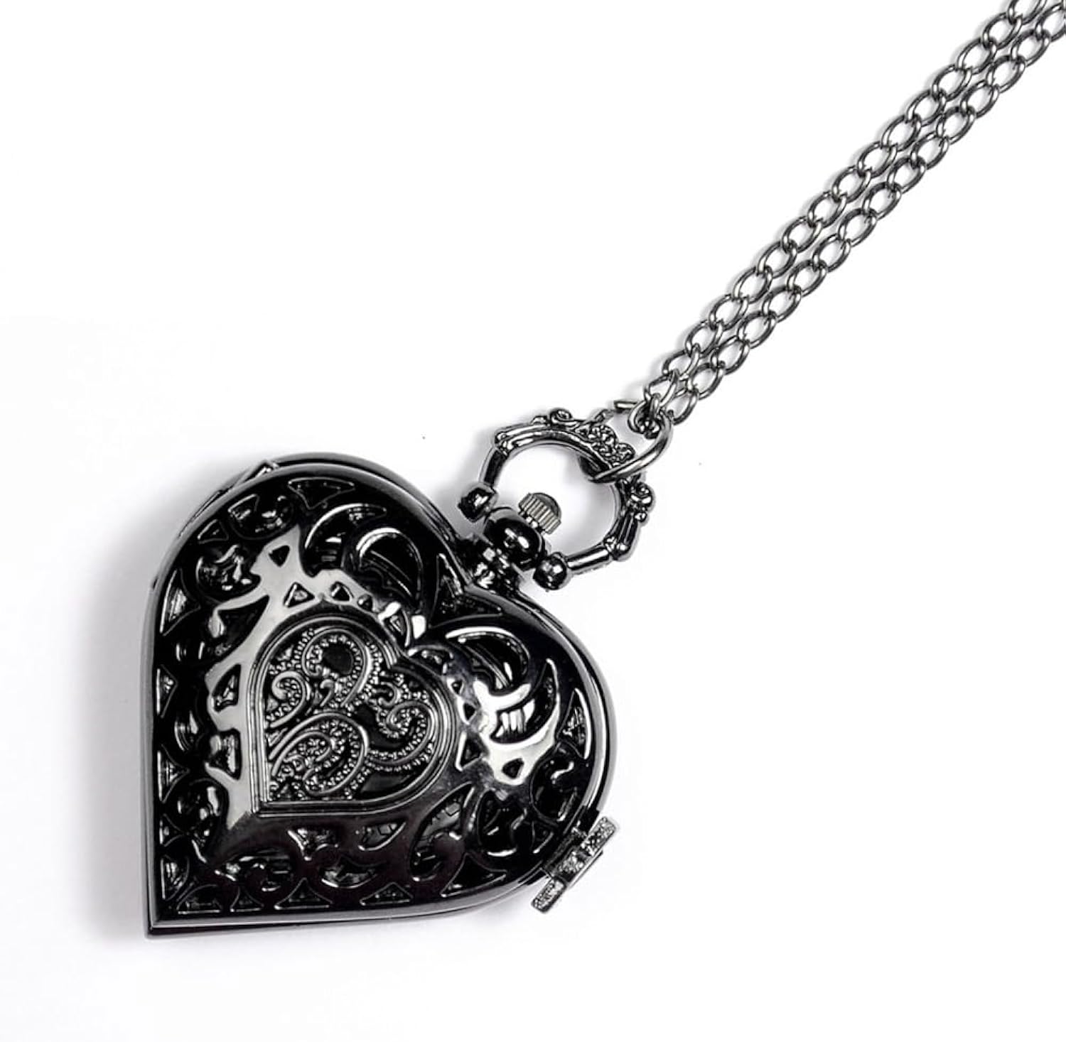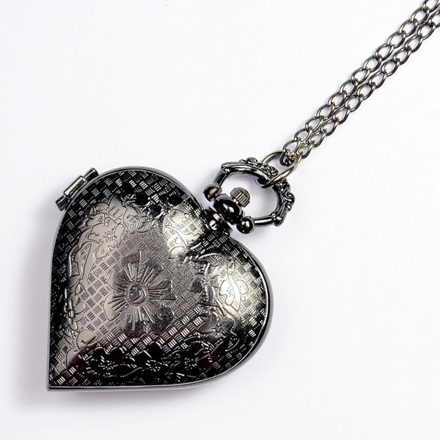 Unique and elegant love-heart with hollow pocket watch case, Silver stainless steel tone metal, the charming pendant watch brings you a lot of compliments.