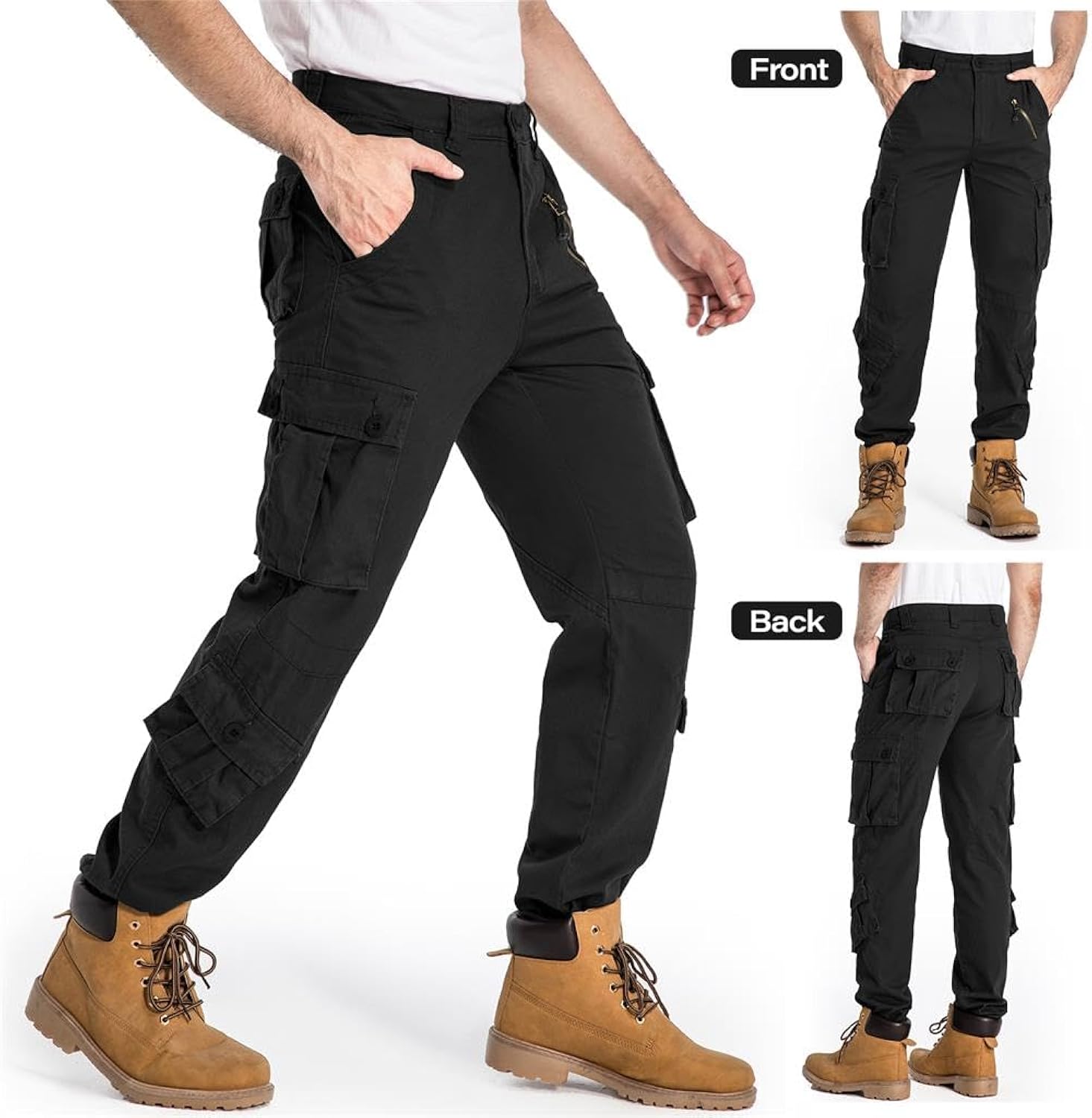 Men's cargo work pants for outdoor activities,Front slant pocket x2; thigh buttoned flap pocket x2;leg buttoned flap pocket x2; rear buttoned flap pocket x2; Left slant decoration zipper pocket x1. Easy care wrinkle resistant fabrics, roomy pockets & sturdy zippers & buttons.