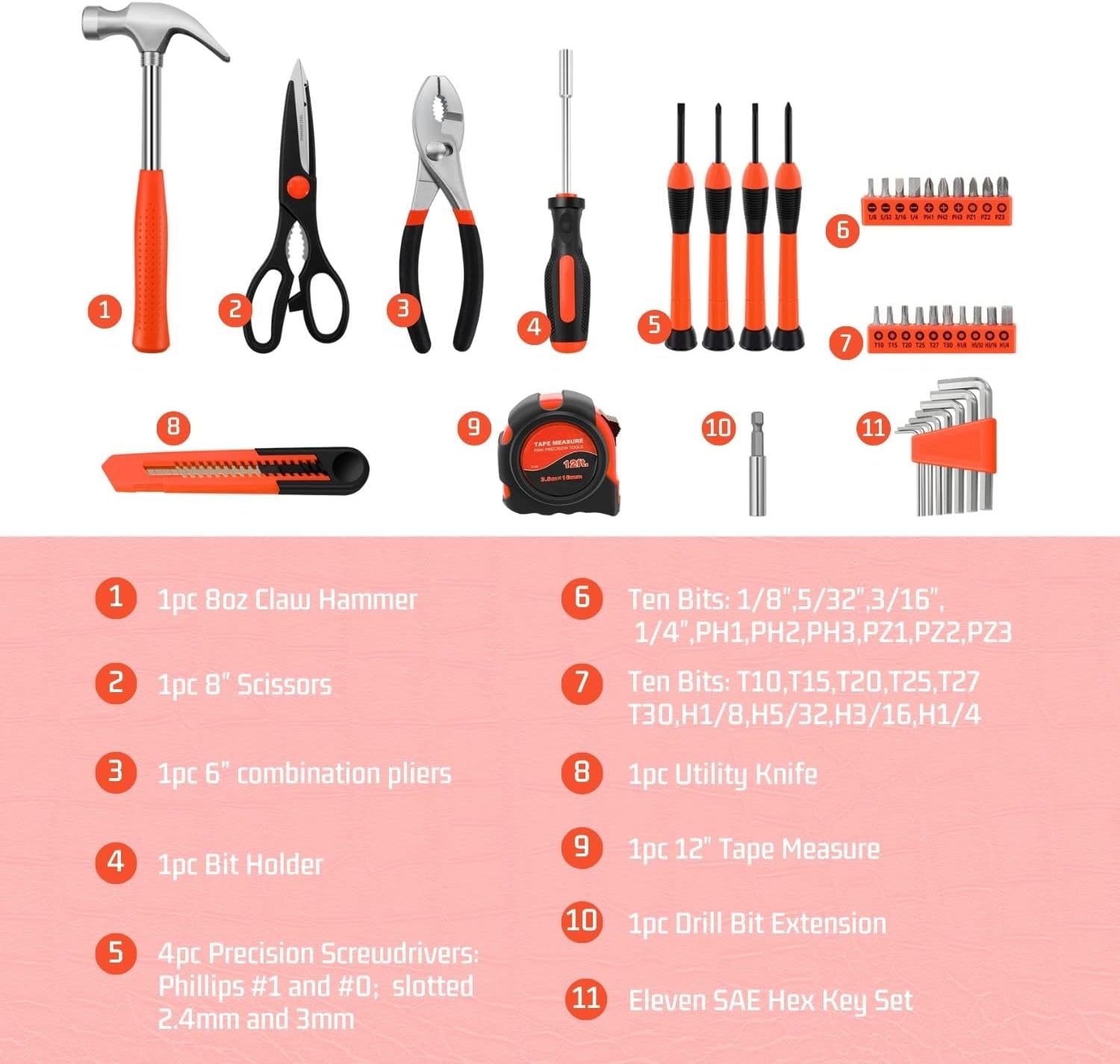 Tools Included - Includes a 12-foot tape measure, claw hammer, 6-inch slip joint pliers, eight SAE hex keys, ratcheting bit driver, 8-inch scissors,20 bits, plastic knife, four precision screwdrivers, and a sturdy tool case