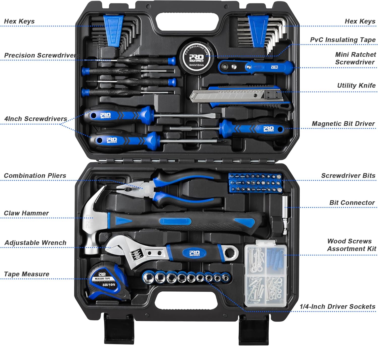 [Great Gift Choice] -This tool kit is easy to carry and stock. It is a good gift choice for men and women. Kindly Tip: When opening the toolbox, please place the side with ''Prostormer'' logo on the top to prevent the tools falling out from the box.