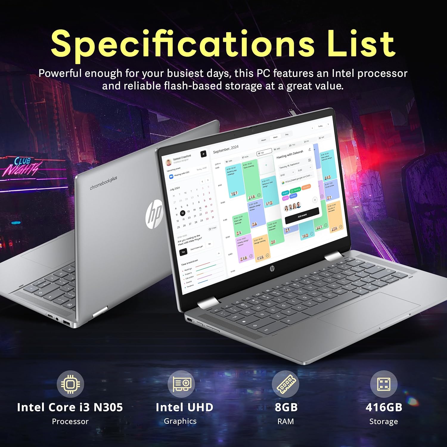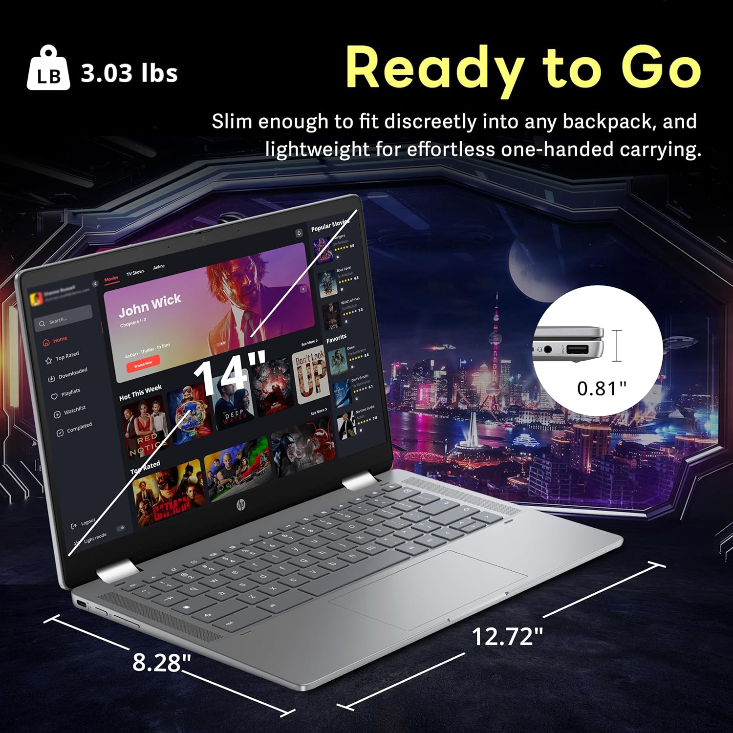 【Chrome OS】Chrome OS is secure, fast, up-to-date, versatile, and simple. 【Dimensions & Weight】12.72 x 8.28 x 0.81 inches, 3.03 lbs. 【Ports】2 x USB-C 3.0, 1 x USB-A 3.0, 1x Headphone Jack, Wi-Fi 6E + Bluetooth. HD Audio with stereo speakers.【Bonus Docking Station Set】1x 7-in-1 Docking Station w/ 128GB SSD, 1x 32GB MicroSD Card w/ Adapter, 1x Type-C Data Cable, 1x 3-in-1 Charging Cable, 1x Suede Cleaning Cloth.