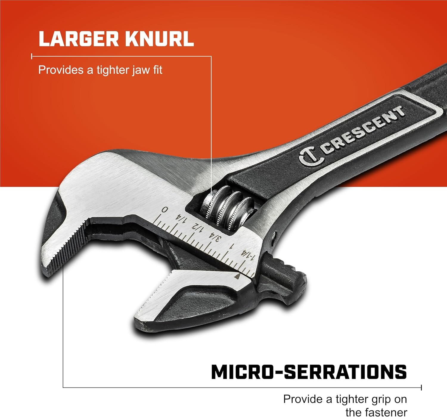 Micro-serrations on the jaws provide a tighter grip on the fastener thus helping to generate 4x more torque than traditional adjustable wrenches