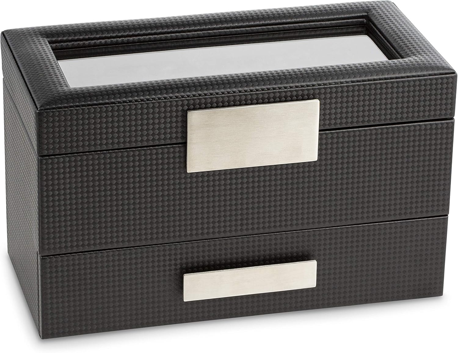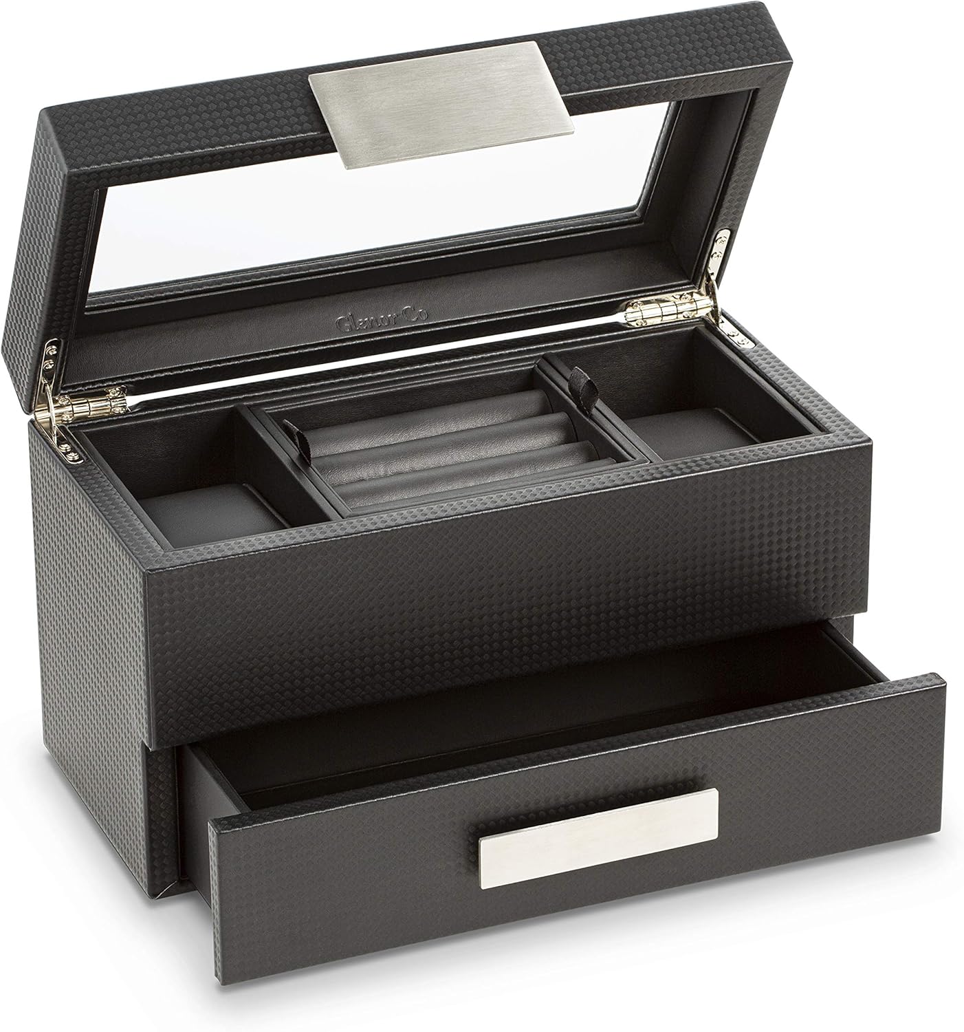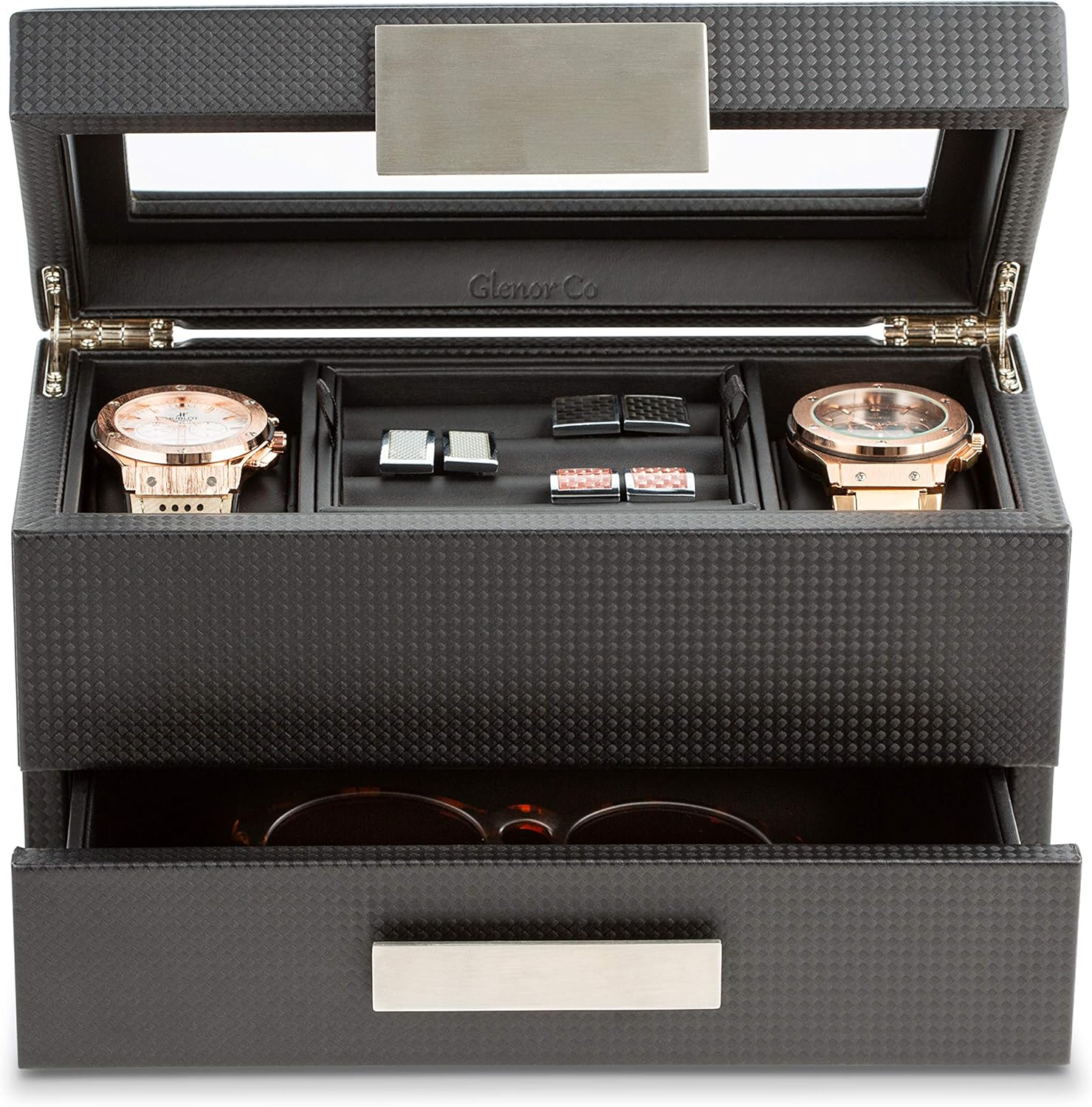 Glenor Co Valet Jewelry Watch Box for Men - Carbon Fiber Texture Organizer with Glass Top, Drawer & Tray - Holder for Watc...