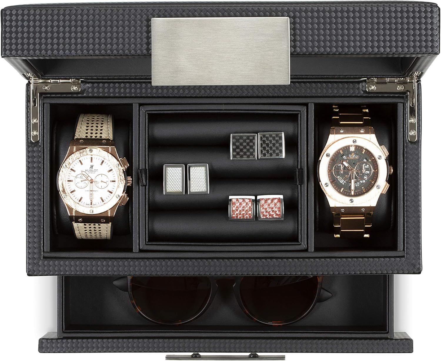 STAY ORGANIZED - Keep your watches, sunglasses and other valuables organized , all in one place and in one glance. This small valet box takes up minimal space on your dresser but holds a whole lot. It will hold ; 2 large watches , 6 pairs of cufflinks, tie clips or cash in the hidden compartment, sunglasses , purses , pens and other large accessories in the bottom drawer. Save critical time and turn your frantic frustrated mornings into a breeze.