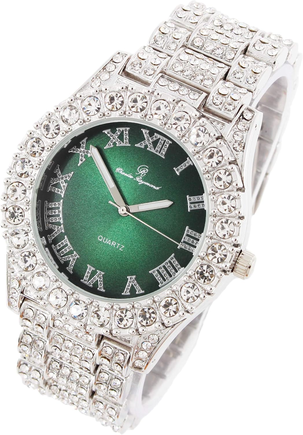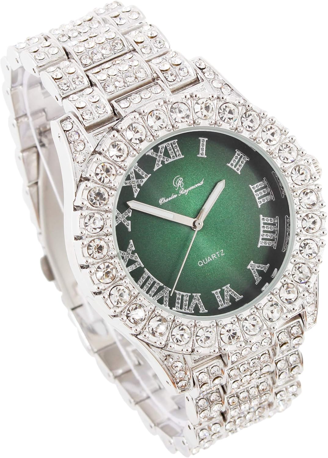 Mens Big Rocks with Roman Numerals Fully Iced Out Colorful Dial Watch - ST10327 RN Single (Silver Money Green)
