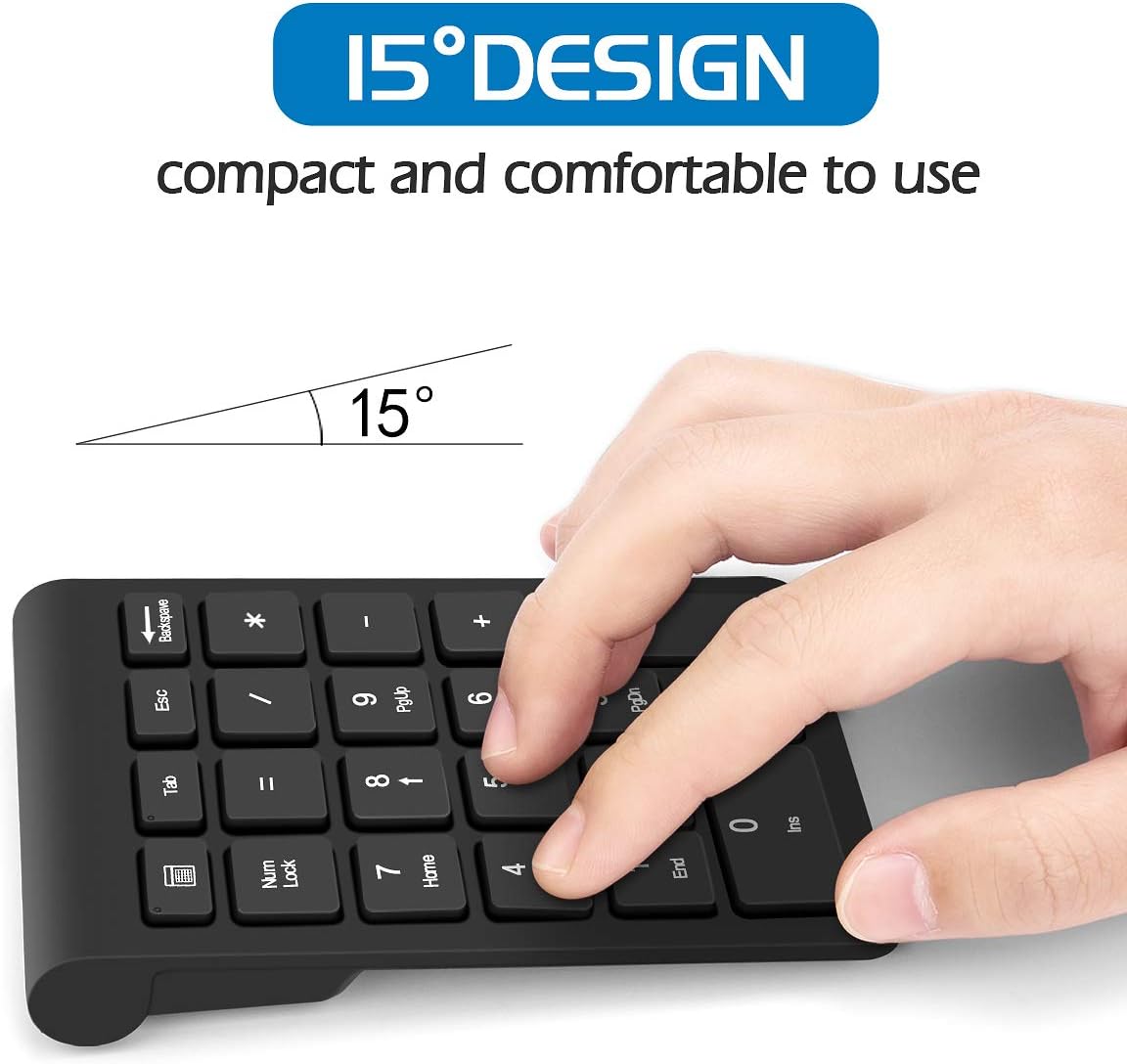 2. Portable And Easy To Use: Our Number Pad, a great addition to your laptop accessories collection, is only 87g. As a key laptop accessory, the Numeric Keyboard works by 2.4GHz wireless technology, with Plug and Play functionality. You can just plug the receiver into a USB port of your laptop. No device drivers needed, no delays and dropouts, ensuring fast data transmission. The maximum working range up to 32.8 ft. The Receiver is inserted in the battery compartment of the keyboard, making it convenient to carry around with your laptop.
