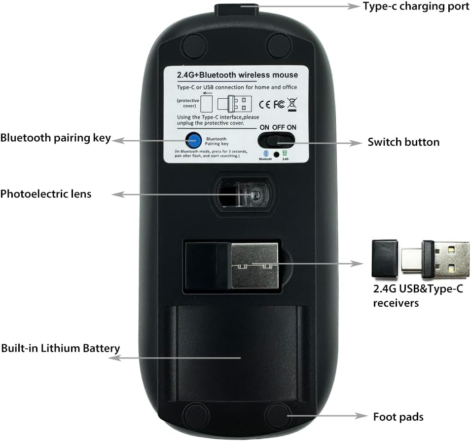 Upgrade version Rechargeable 4 Modes bluetooth mouse(Bluetooth 3.0/5.2+USB2.4G/Type C), Dual-port 2-in-1 Receiver USB2.4G/Type-C You can switch between the 4 connection modes, adds more fun to the boring office life.