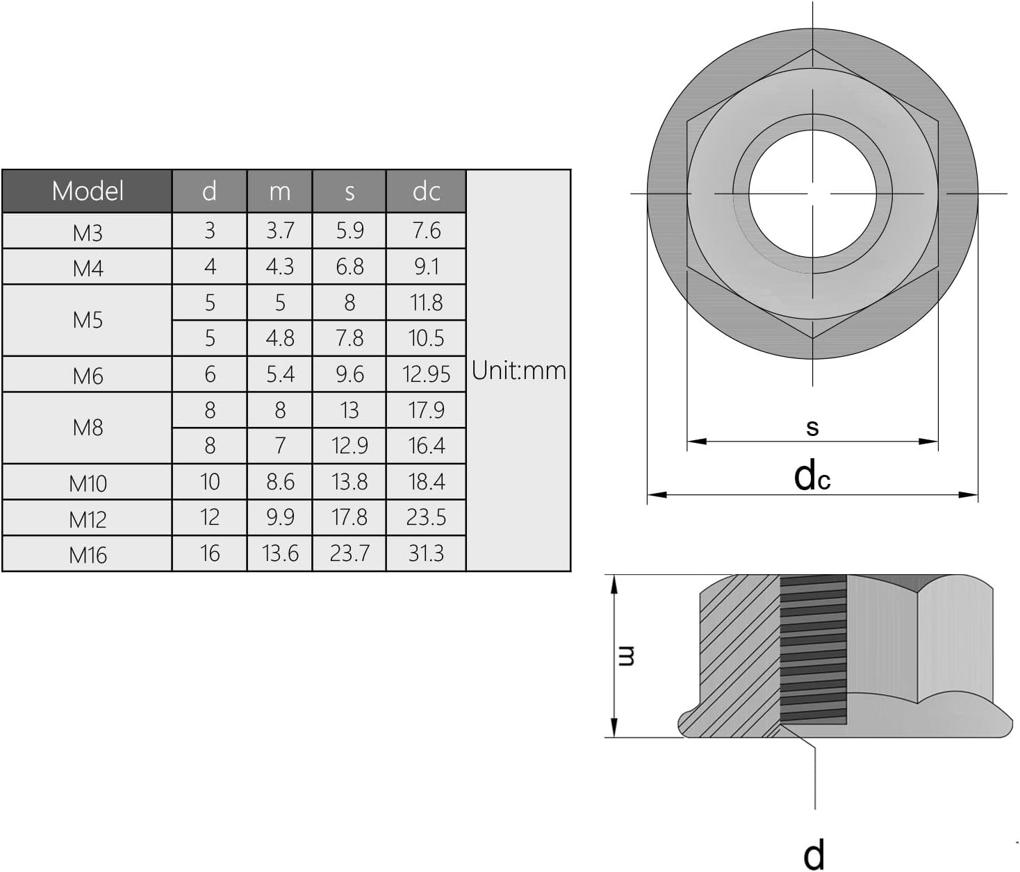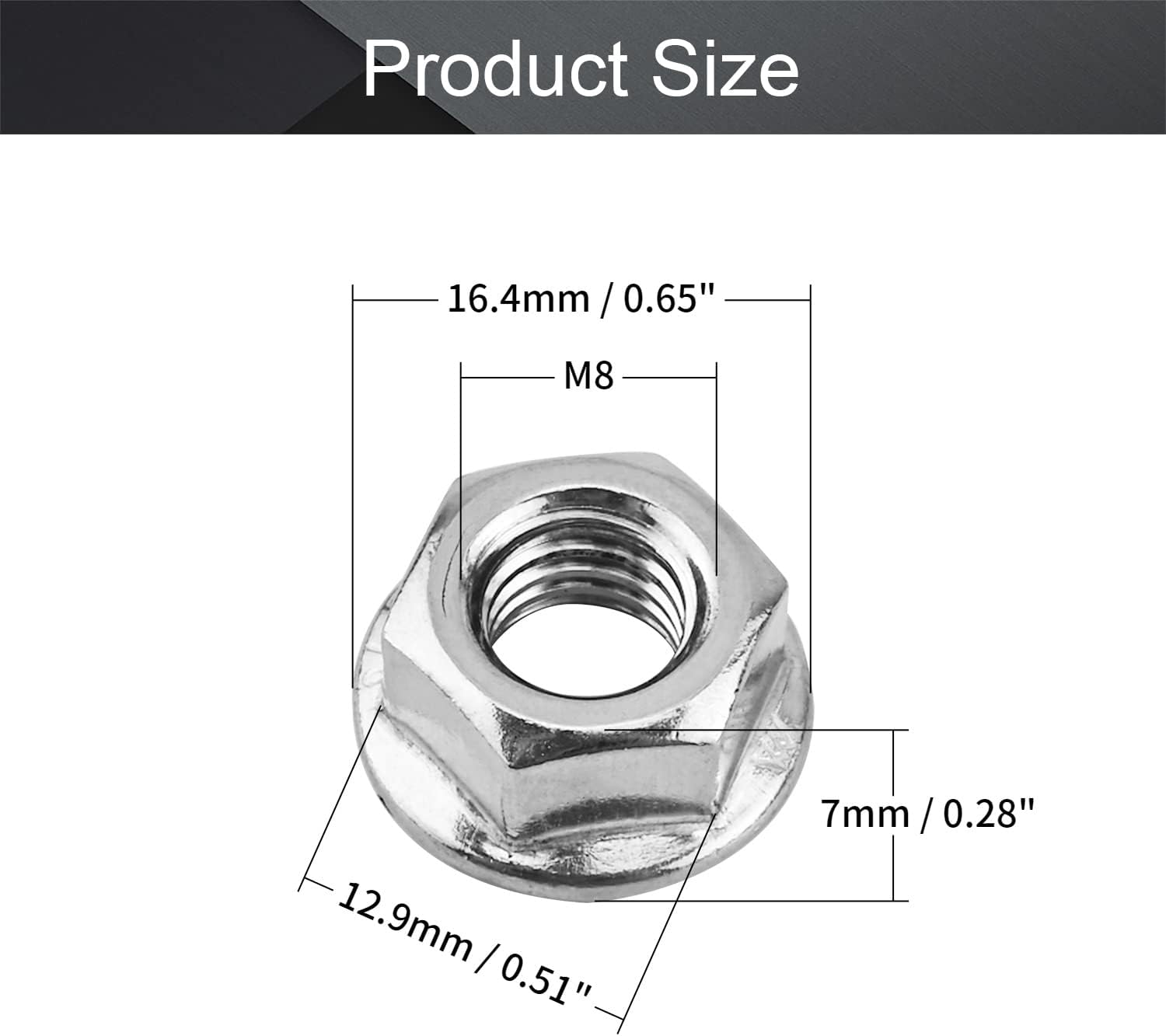 ✅【DIMENSION】- Thread Diameter: M8; Flange Diameter: 12.9mm/0.51 "; Width Across Flat Size : 16.4mm/0.65 "; Nut Height : 7mm/0.28 "