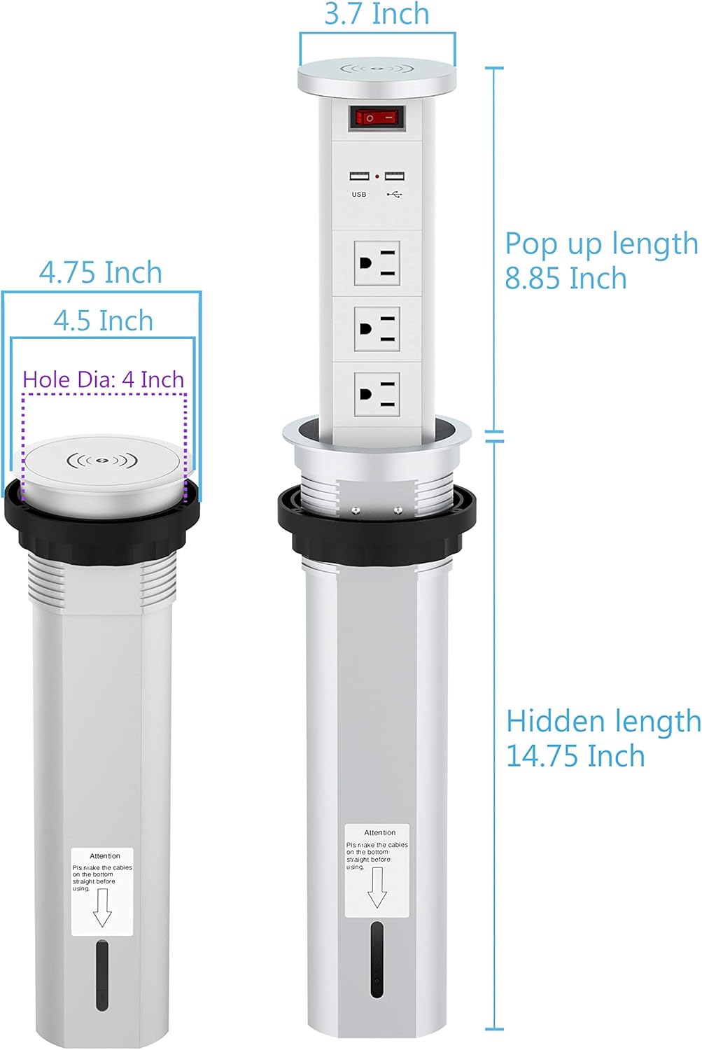 【Easy to Install and Use】: Cut a 4" hole in the countertop , remove the ring lock and slide the body from top, screw the ring tight from bottom, then complete the installtion. Just push the surface of the power socket and it will automatically rises/retract. This outlet hidden length 14" , and pop up length 8.7", it can be install both vertical and horizontal (Please cautious on its size, the item might larger than your expect).