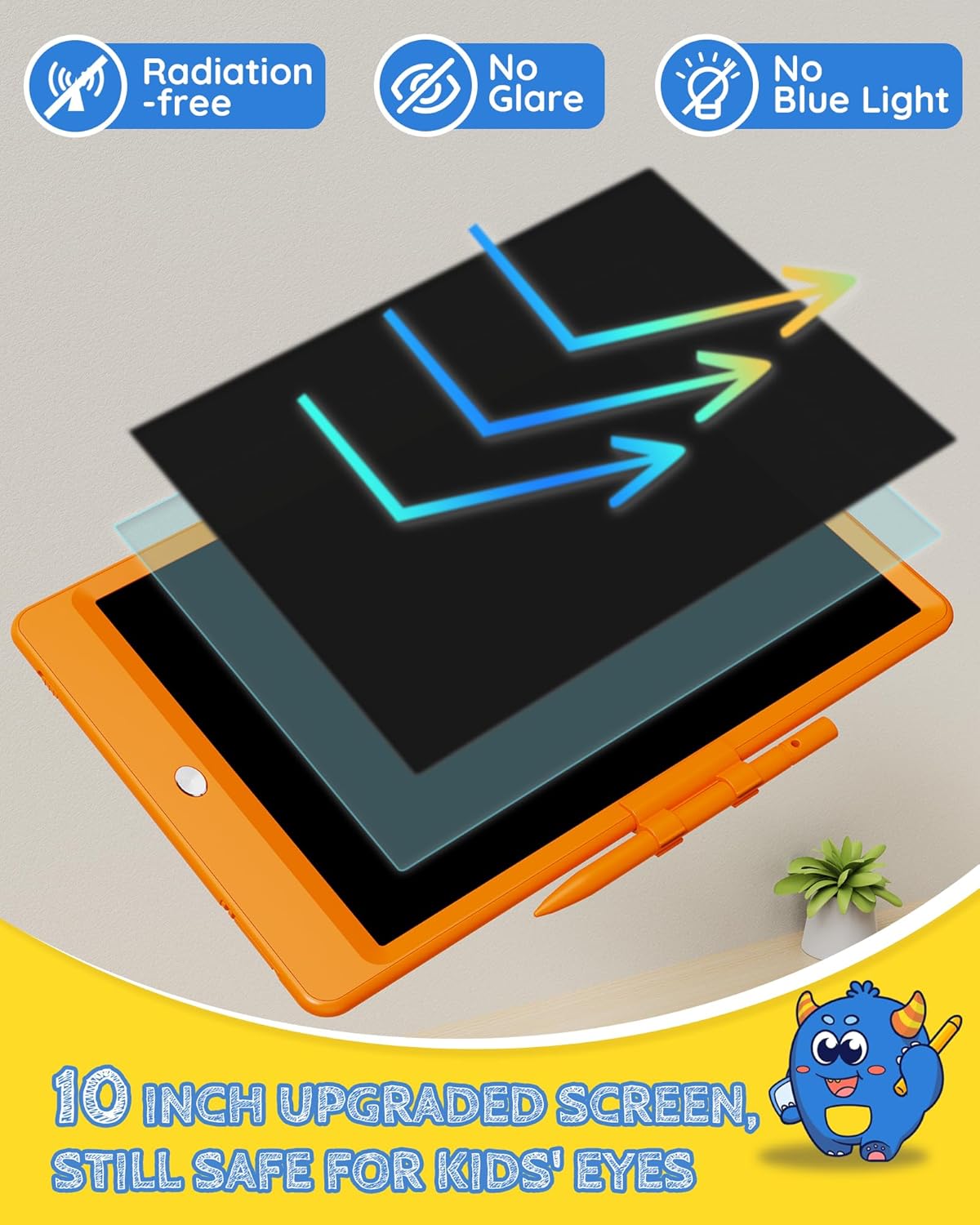 Free Child’s Imagination: Tekfun LCD writing tablet provides 10 inches of space for kid’s writing and drawing, free children's imagination. The eye-protection colorful screen of doodle board provides a better painting experience, avoiding injury to a child’s eyes from long-term use