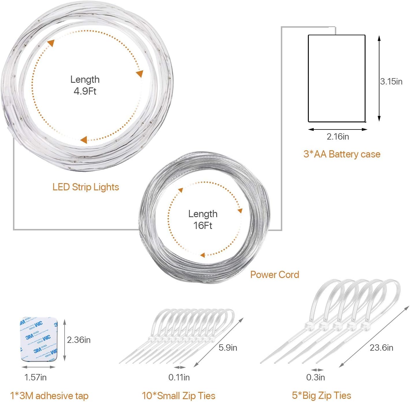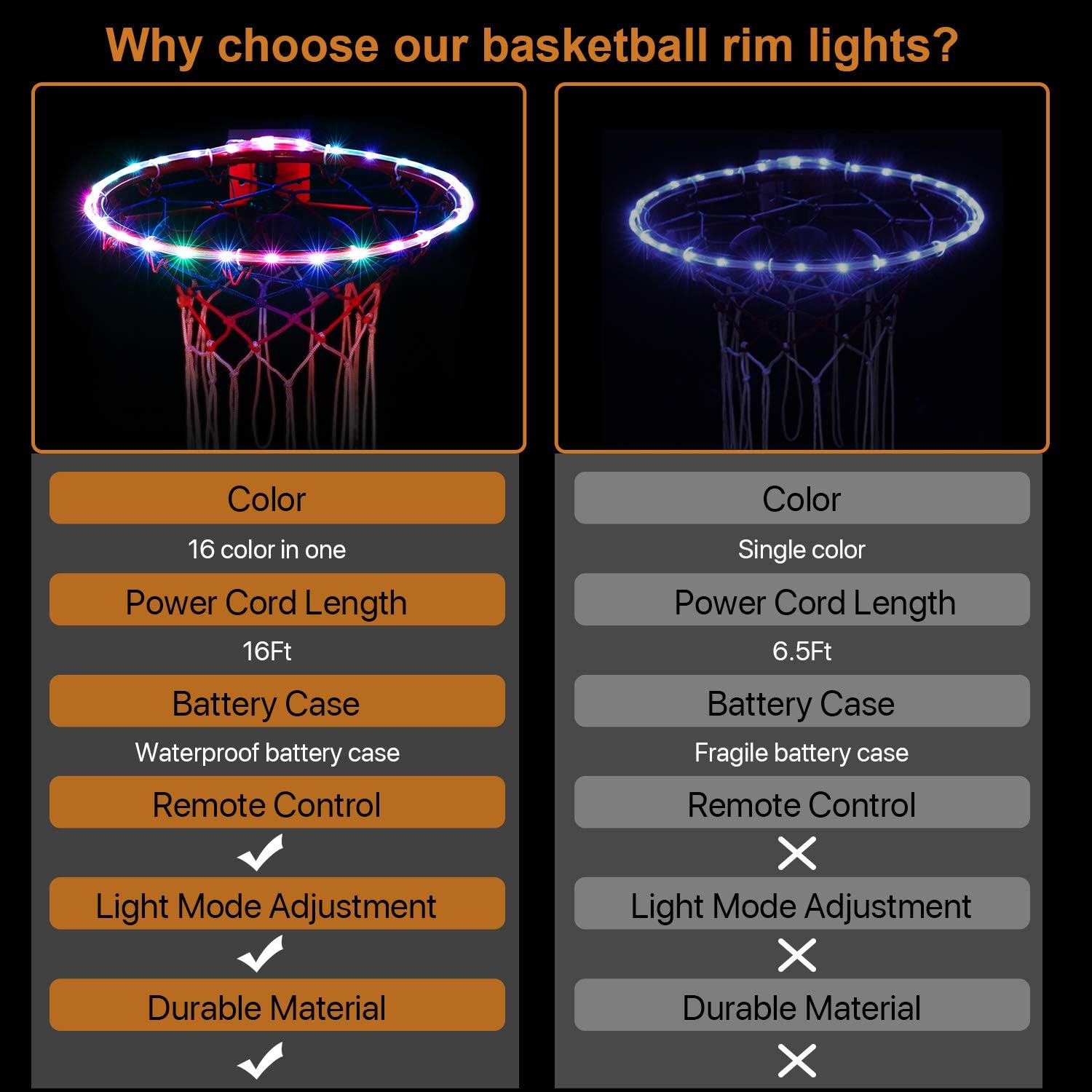 【GOOD GIFT FOR KIDS】: Designed for basketball fans who playing at night. Fit the size of the standard basketball frame. Package included:1x LED strap light, 1x battery box(AA batteries not included),10x small zip ties, 5x large zip ties, 1x 3M adhesive pads. 1-year replacement service.