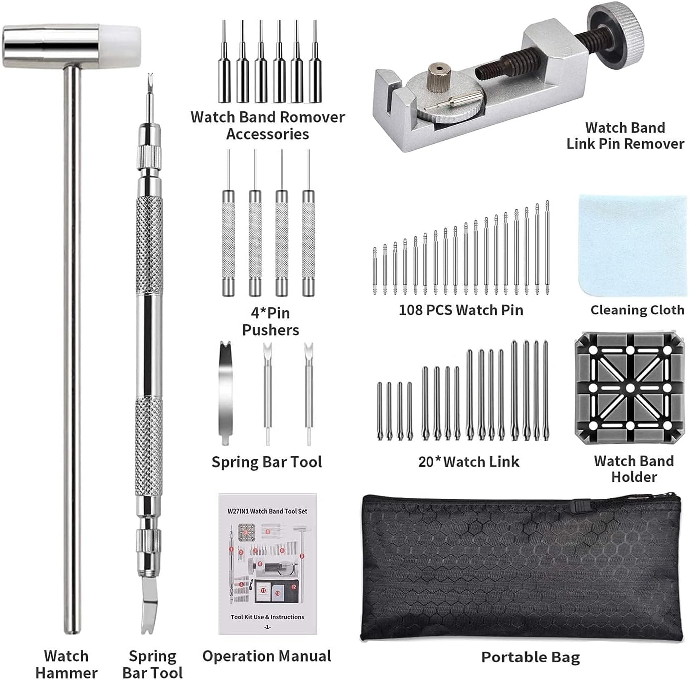 Complete Set: Includes a watch link remover, spring bar tool with 4 tips, hammer, band holder, 4 punch pins, 108 spring bars, 20 links, a cleaning cloth, and a manual