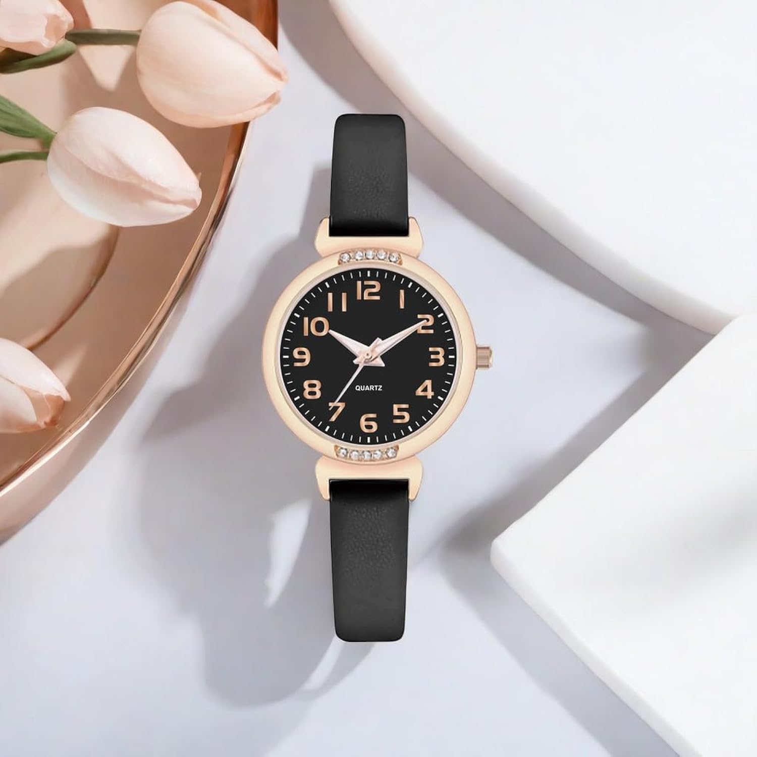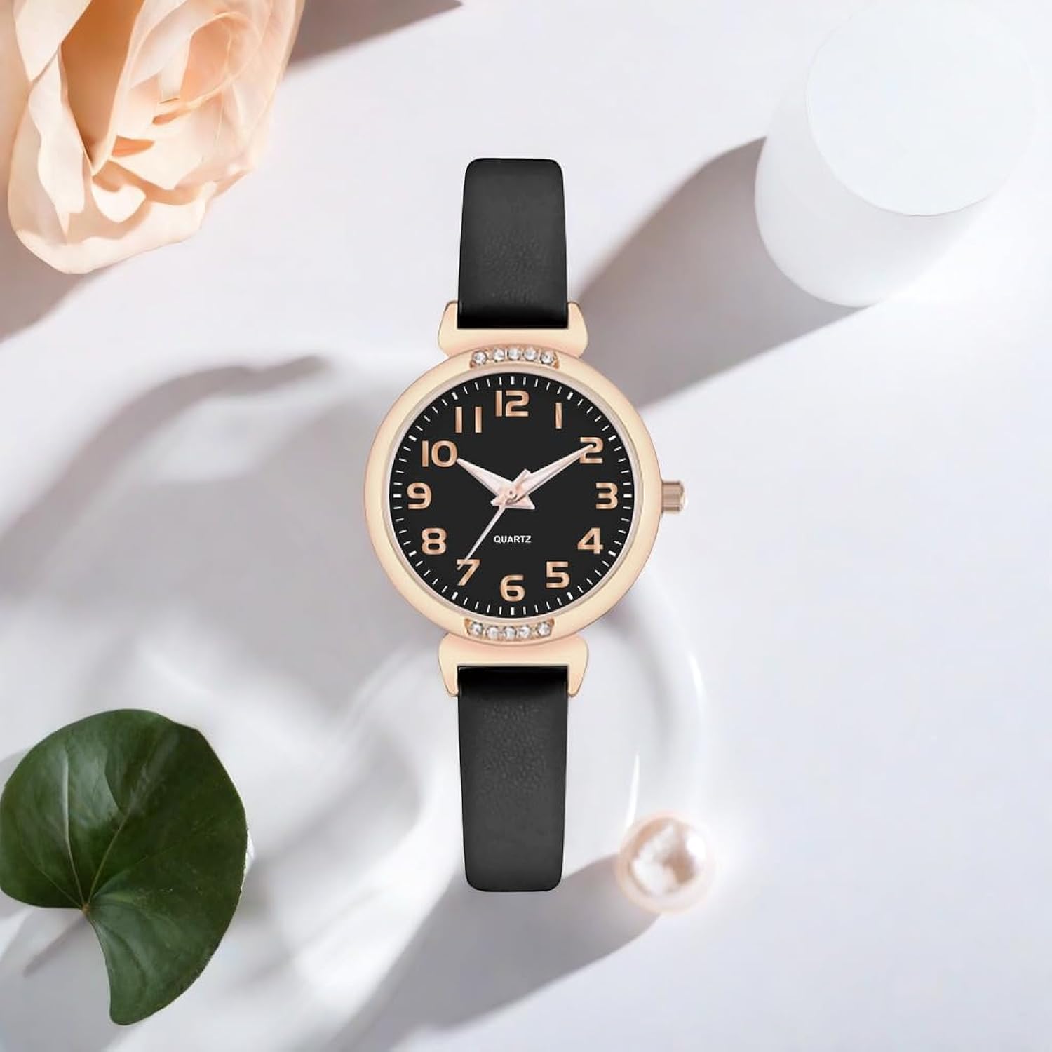 Elegant Design: Featuring a sleek black dial adorned with sparkling crystals, this women's watch exudes sophistication and style.