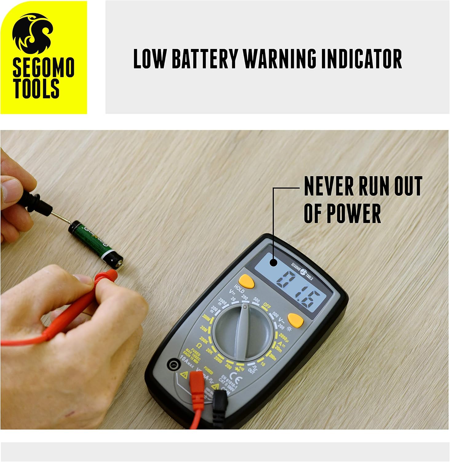 [ See In Dark Places ] The large backlit LCD display of this digital voltmeter allows you to see measurements especially in poorly lit areas. Low battery warning indication allows for quick battery change without the risk of running out of power.