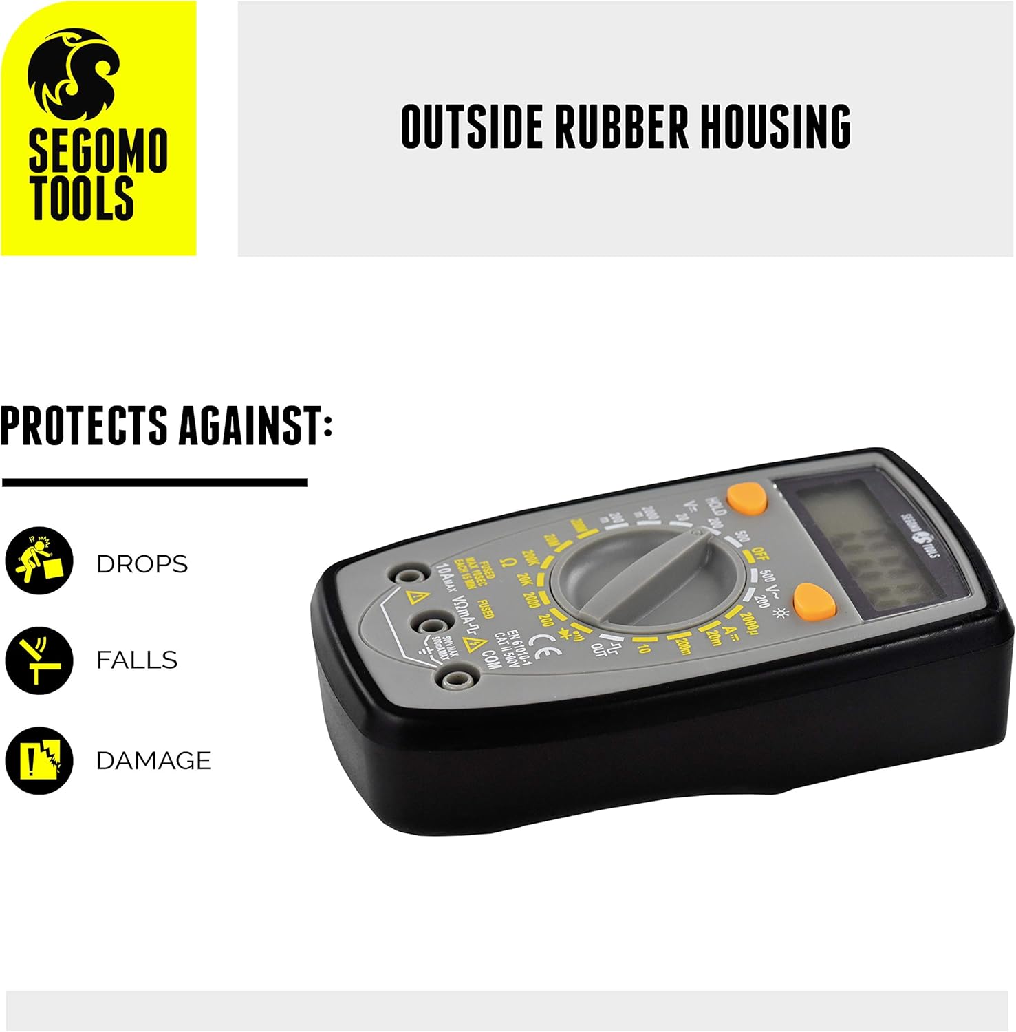 [ Fall Proof & Hands Free] The protective outside rubber housing guards against damage from drops or falls. The built-in kickstand allows you to use this multi meter hands free.
