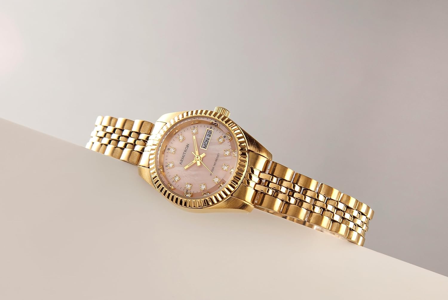 Light pink mother-of-pearl dial with day/date calendar window; gold-tone hands and clear crystal markers; black outer minute track