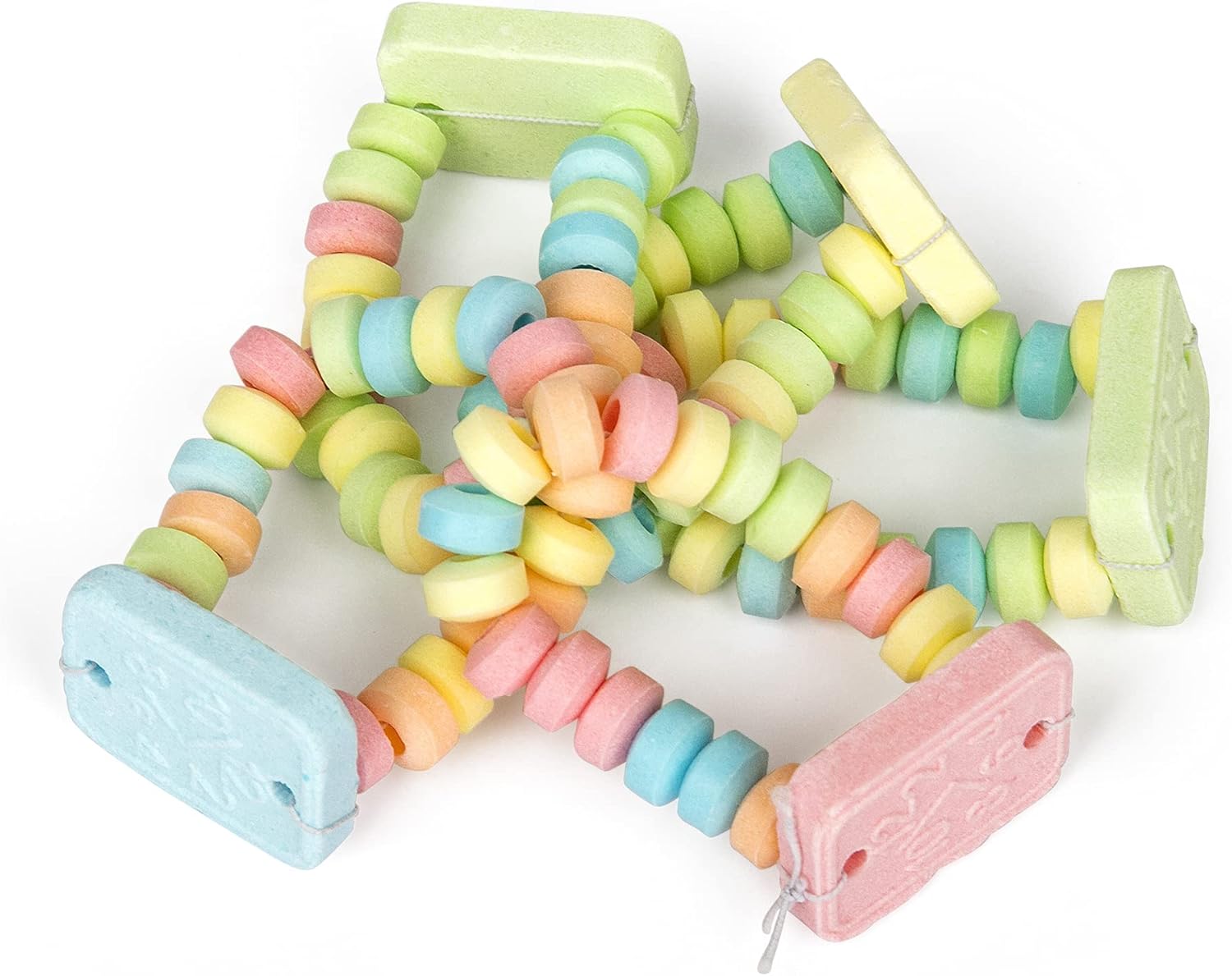 BRACELET WATCH CANDY: Delightful pastel-colored, fruit-flavored candies on a string, individually wrapped and packaged in an attractive display tub, making them a whimsical and delicious accessory for any occasion, from casual snacking to vibrant celebrations.
