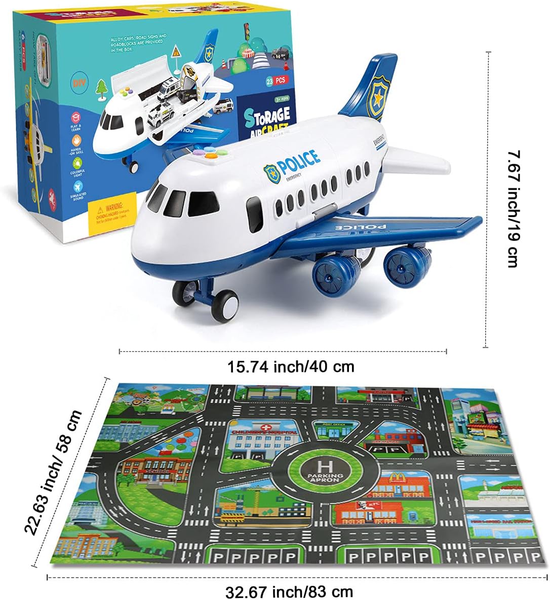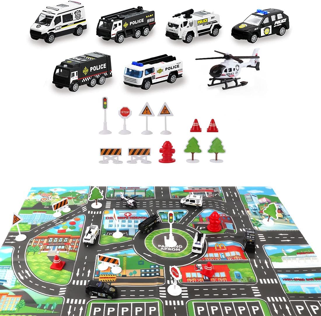SUPER VALUE:6 die cast Police Cars and 1 City Life Play Mat and 1 Helicopter Toy and 11 Road Signs and Functions in One Carrier Plane.Enrich the game and stimulate your child's imagination.