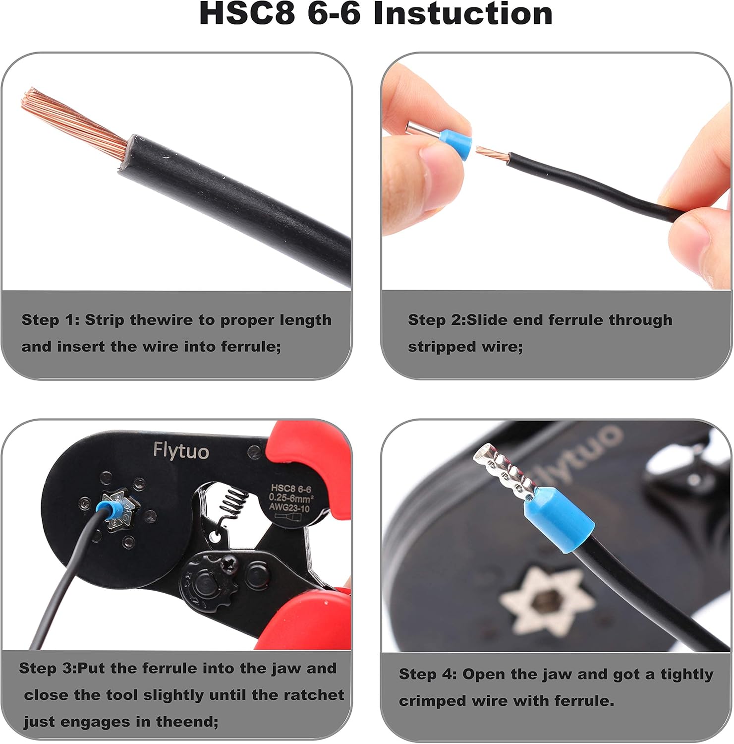 [Ferrule Crimping Range]: The ferrule crimping tool range is 0.25-6mm²/23-10AWG, suitable for most typed insulated, non-insulated sleeve terminals and connectors