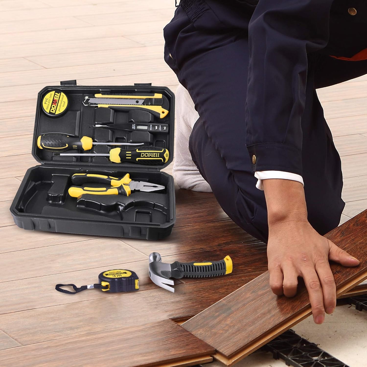 EASY TO CARRY & STORAGE:This tool kit comes with a sturdy blow-molded case for easy storage and portability. Sturdy interior and organizers of this tool box keep tools in place. Put the side with ''DOWELL'' up when opening the toolbox to prevent the tools falling out from the box.