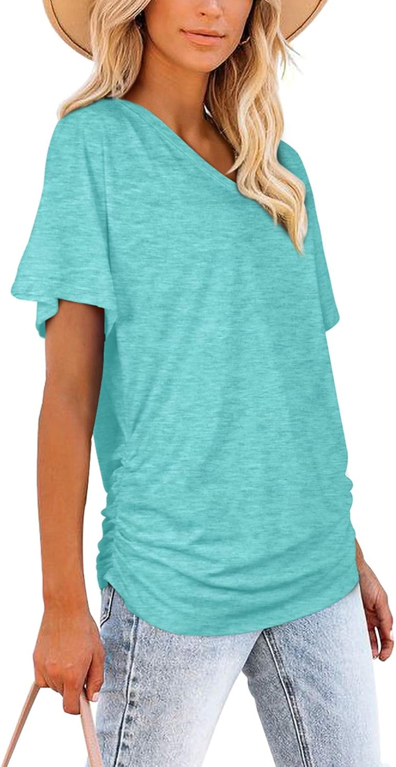 Feature: Short sleeve v neck dolman tops with side shirring design, loose fit, basic t-shirts, v neck,solid color, lightweight, this casual top comes in a variety of colors for you to choose from.