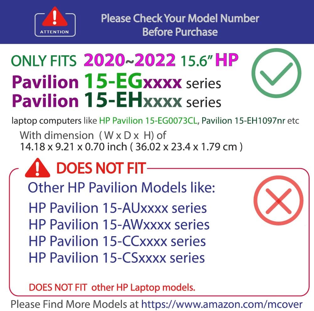 Designed to perfectly fit the 2020 ~ 2022 15.6" HP Pavilion 15-EGxxxx / Pavilion 15-EHxxxx Series Laptop with dimension of 14.18 x 9.21 x 0.70 ( 36.02 x 23.4 x 1.79 cm )