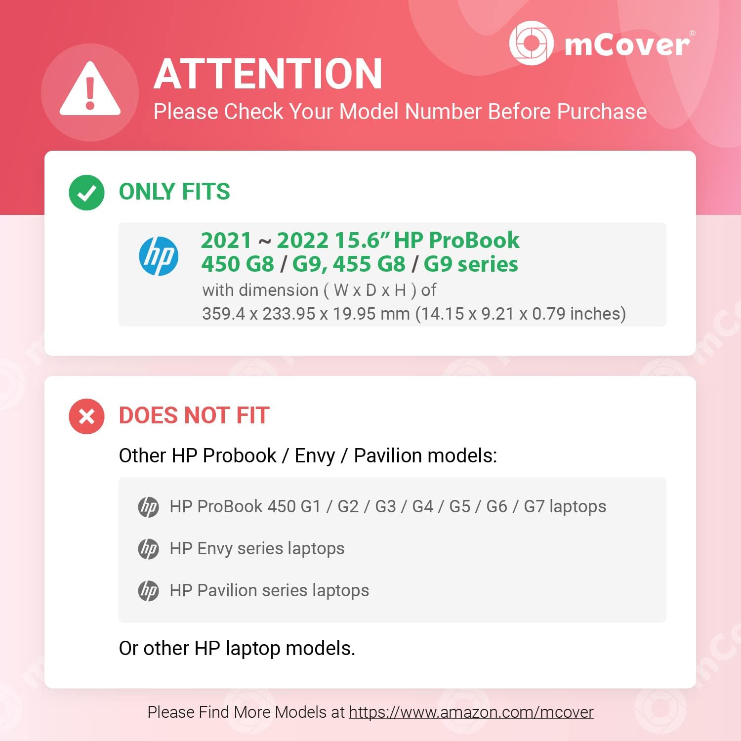Designed to perfectly fit the 2021~2022 15.6" HP ProBook 450 G8 / G9 and 455 G8 / G9 series Notebook PC with dimension of 14.15 x 9.21 x 0.79 inch ( 359.4 x 233.95 x 19.95 mm )