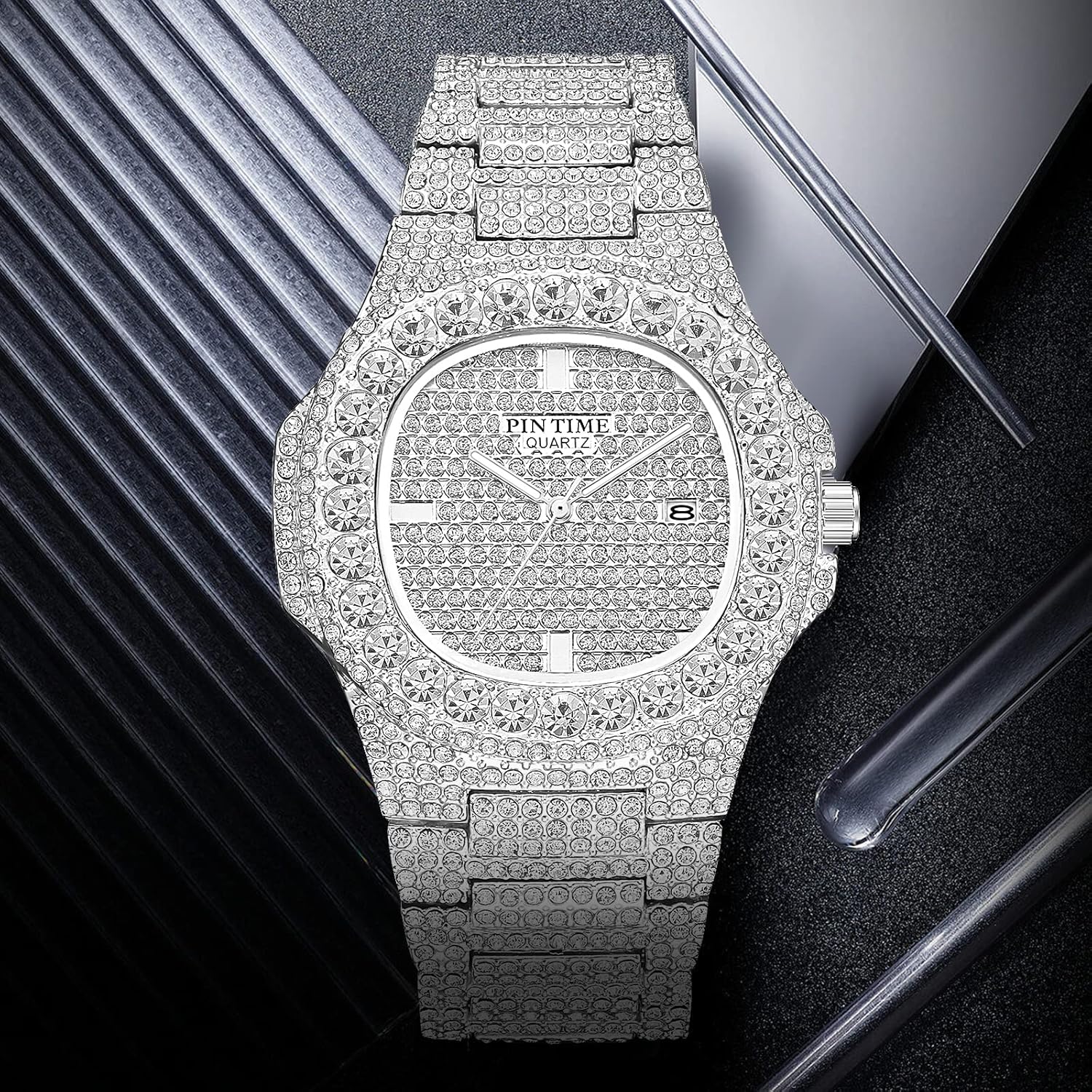 【FASHION DESIGN】: Oblong case; Scratch-resistant mineral glass and crown protective ear design; Fold-over clasp with hidden double push-button; Blinged simple dial with fluorescent pointer hands; and index markers at 6,9,12 o'clock; The date window is at 3 o'clock.