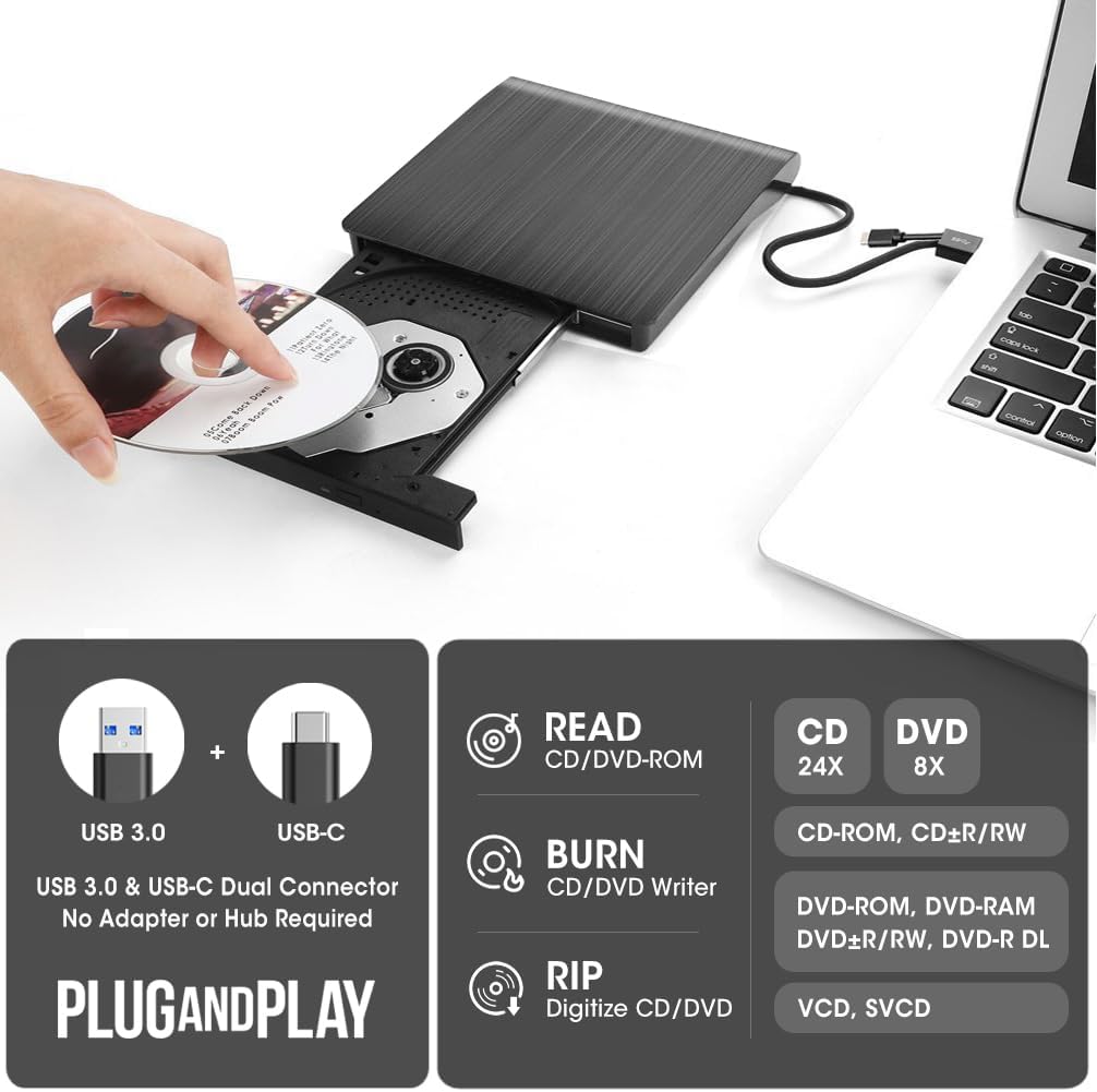 【Premium External CD/DVD Drive for Laptop】If your laptop or desktop computer has no built-in optical drive, this external CD/DVD drive is a great solution. Just plug the data cable (stored underneath the drive) into your laptop or desktop PC > It will be recognized by your PC automatically (Mac will detect and show the icon after inserting a disc) > Insert your CDs or DVDs > Use a media player, burning, or ripping software to read, write, and rip your CDs and DVDs—no complicated setup is needed, as easily as an internal CD/DVD drive. (Scroll down for recommended software and detailed usage steps)