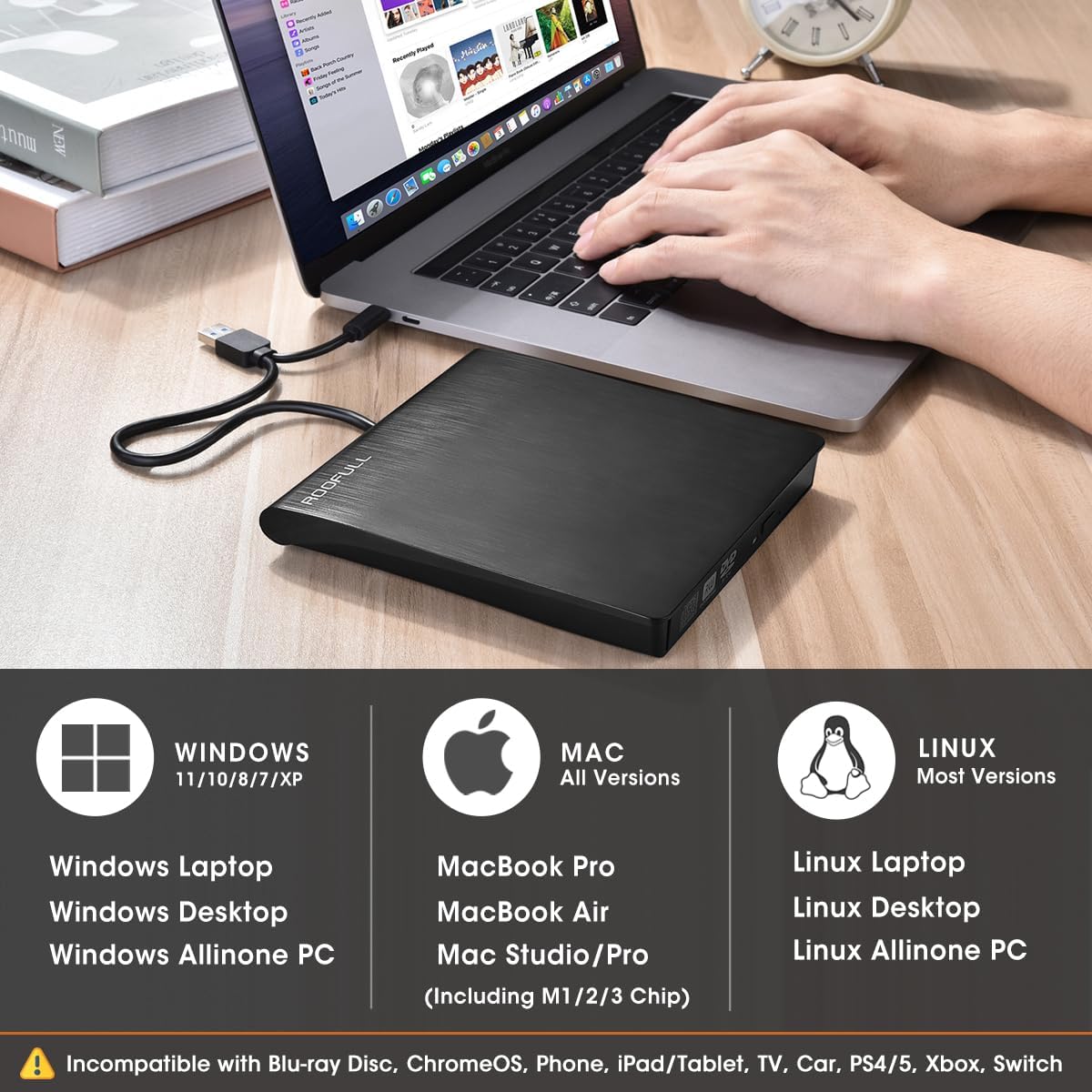 【Best Thing to Know Before Buying】①This USB disc drive is designed for use with Windows, Linux, and Mac PCs. It is not compatible with Chromebooks, mobile phones, iPhones, iPads, cars, projectors, TVs, or Blu-ray discs. ② Due to macOS limitations, the tray cannot open via the button after playing and burning a disc, To eject a disc on Mac computers, right-click on the desktop icon and select "eject," or choose "File" > "Eject" from the menu