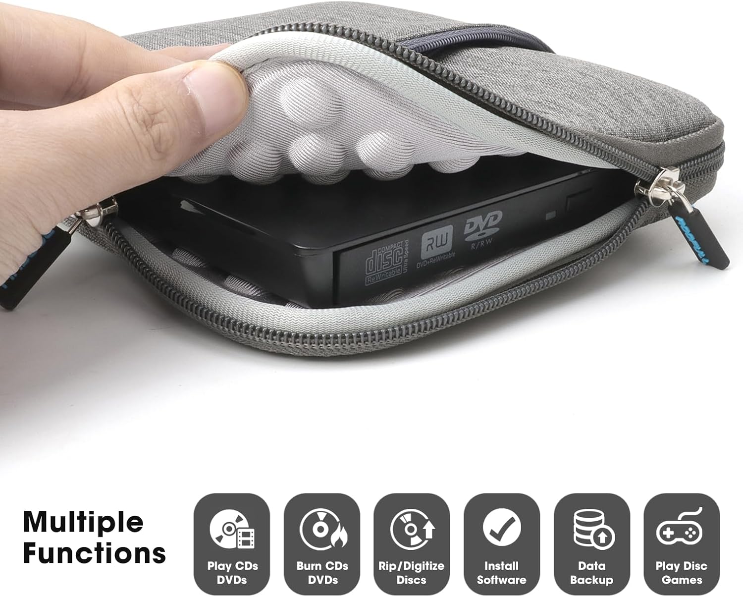 【Slim and Portable DVD Player】This slim external optical player is designed to be compact and portable, making it easy to take with you wherever you go (home, office, or on the go). It comes with a thicker protective storage carrying case sleeve that ensures your device is protected from dust, water, and drops. It's also a good idea as a gift to hobbyists who collect CDs and DVDs.【Package Contain】1* Multifunction CD/DVD drive + 1* USB 3.0 & USB-C Data Cable + 1* USB to 2.5mm Power Supply Cord + 1* User Manual + 1* Protective Carrying Case + 1* SD to micro-SD card adapter. (Note: The other accessories shown in the pictures are for functional demonstration only and are not included)