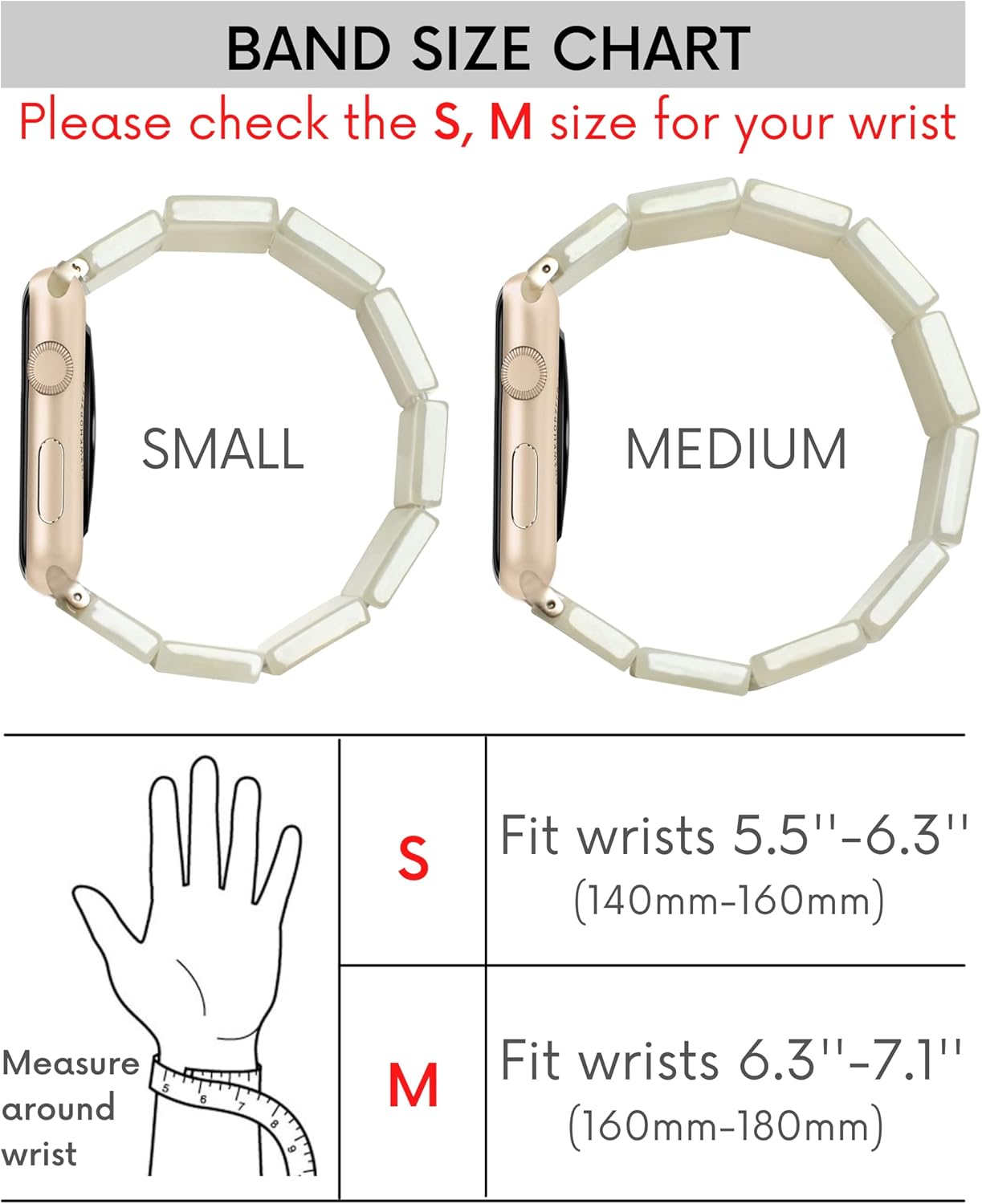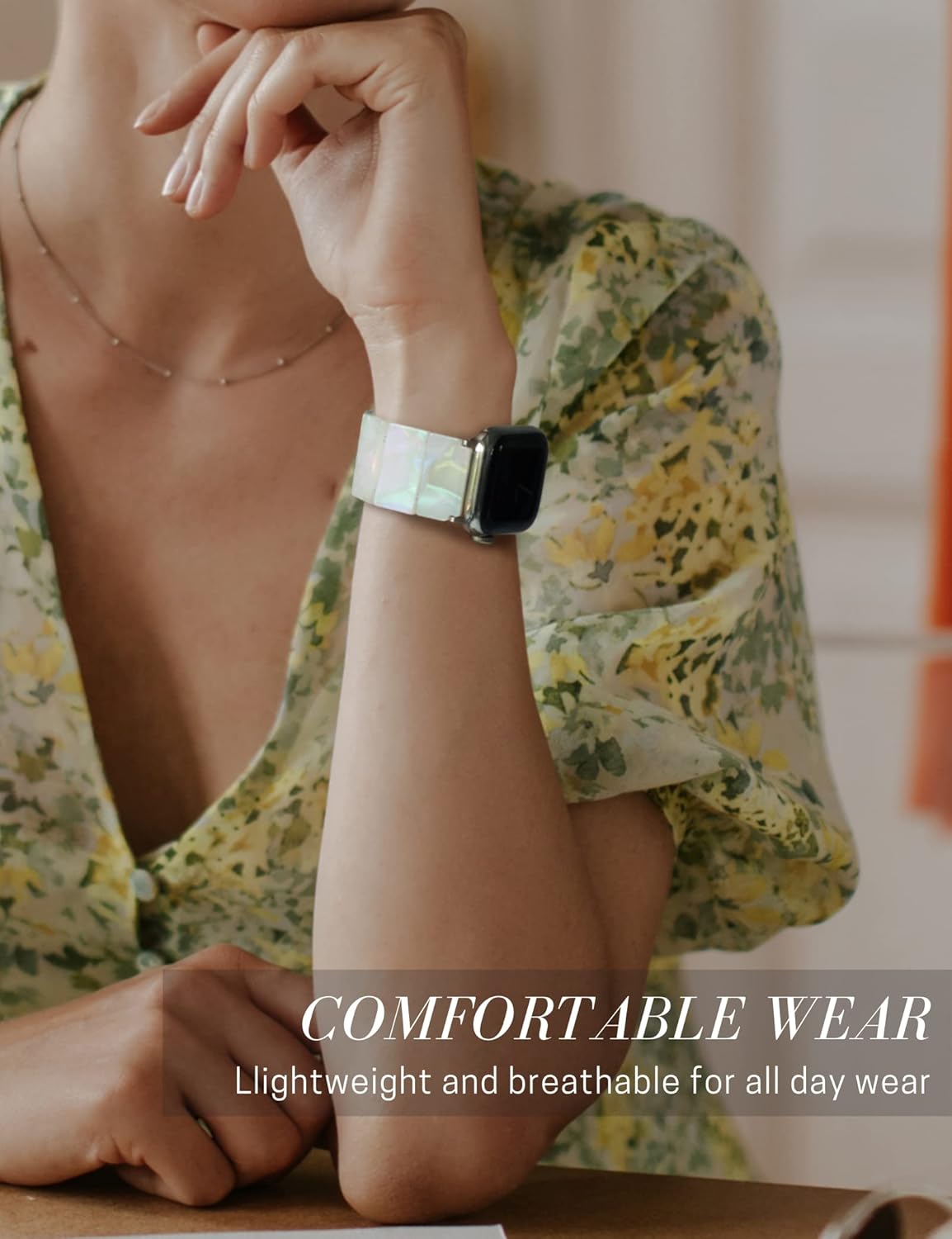 [Premium Material] – The Band is made of high-end resin material called acetate, which is high-polished, lightweight, shimmery and exquisite. It’s vibrant color won't fade over time. The watchband adapter is made of long lasting black-plated stainless steel. The resin pieces are connected by strong elastic cord which is flexible, sturdy and durable.