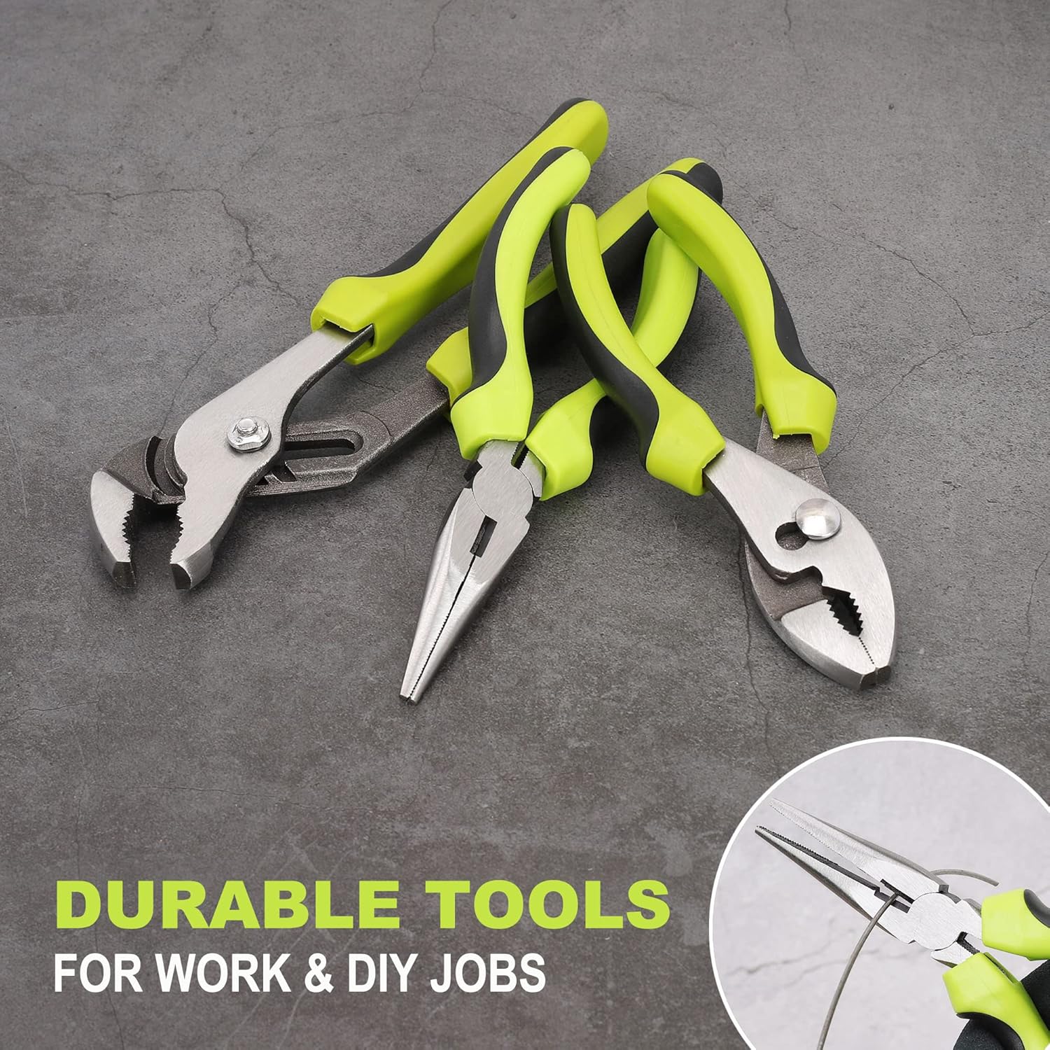 Pliers are constructed by forged steel with heat treatment for strength and durability, hardened cutting edge for easy jobs. 12-inch tool bag for well organization.