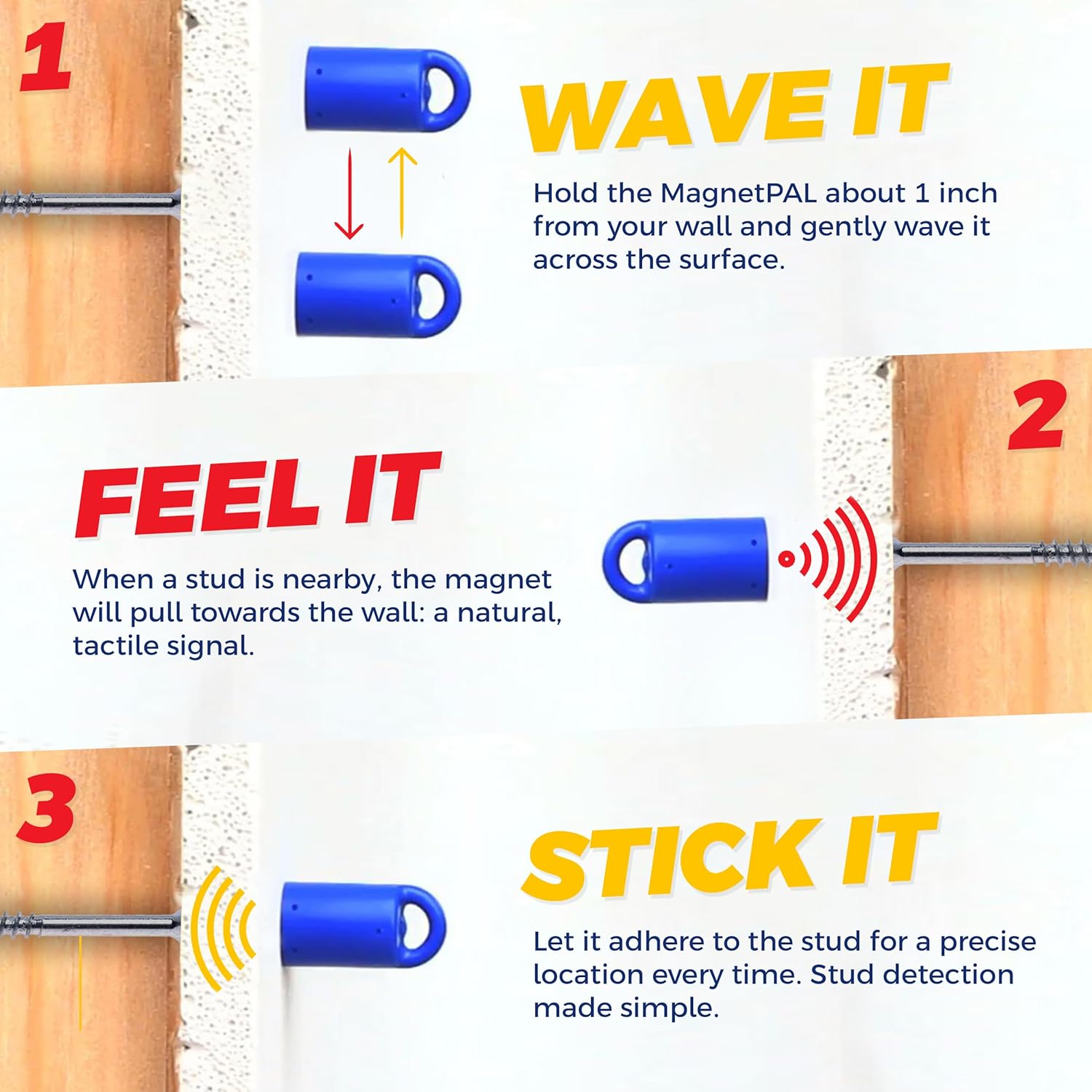 MAGNET WALL STUD FINDER - Simply wave the MagnetPAL over your wall (about 1 inch from the surface) until you feel the wall pull it out of your hand. It will almost ‘magically’ guide the locator to the stud. Once it pulls let it stick to the wall