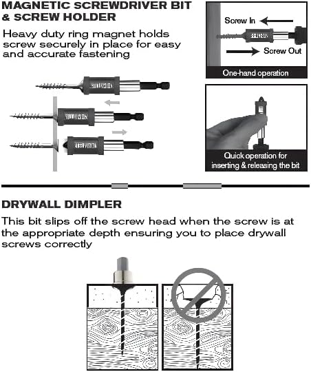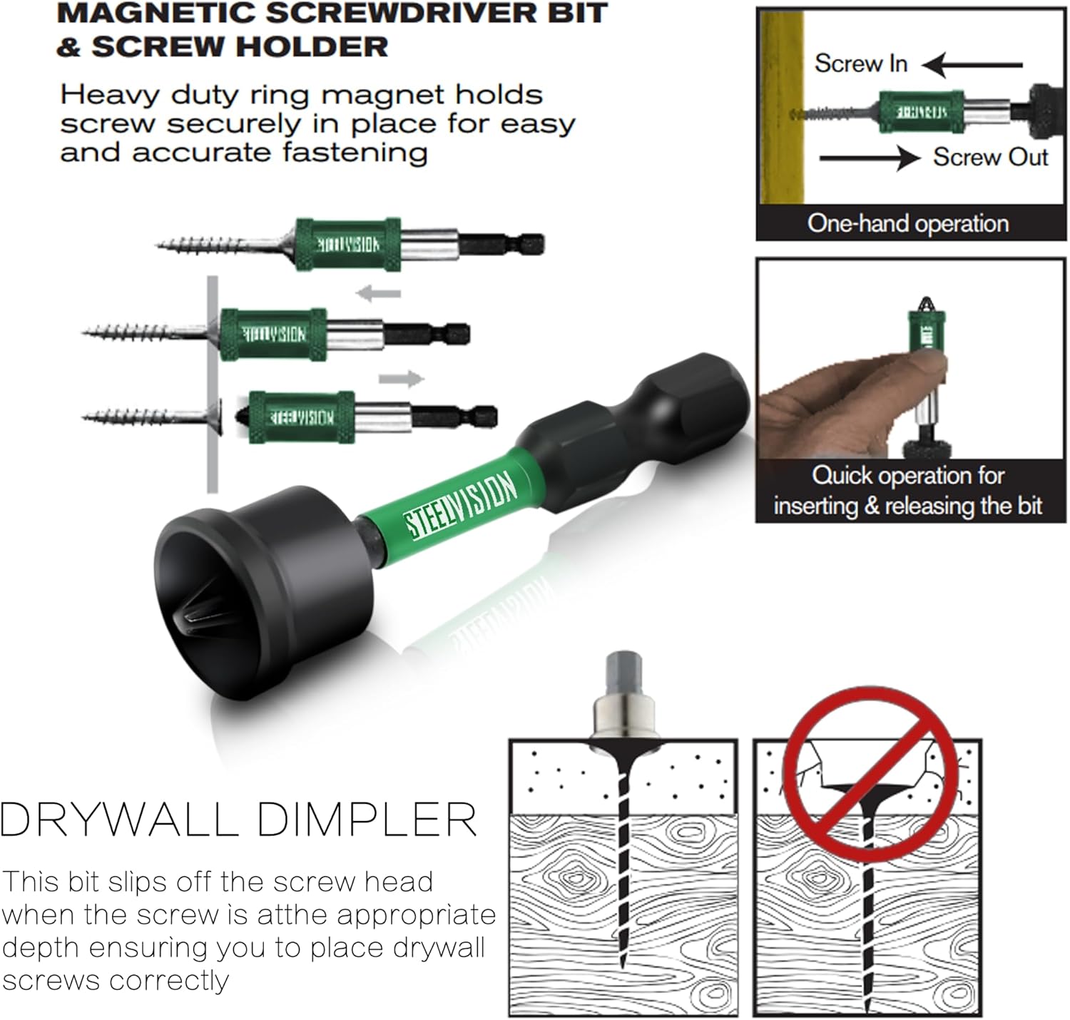 Magnetic Screwdriver Bit Set:Features a strong magnetic ring that securely holds screws in place, providing increased precision and easier handling, especially for drywall installation.