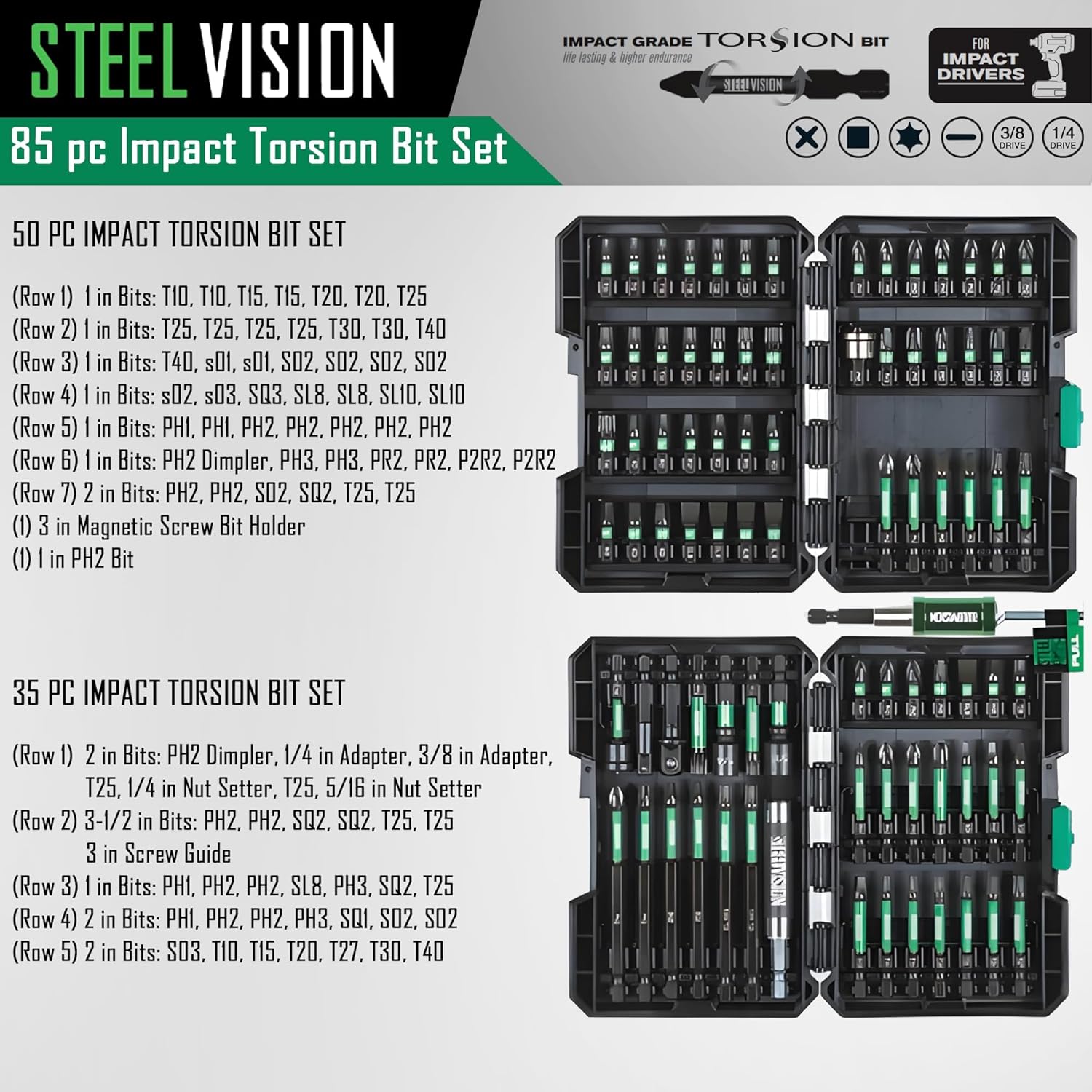 85-Piece Torx Bits Set : * 1-inch Bits: 7 T10, 4 T15, 6 T20, 9 T25, 2 T30, 2 T40, 4 SQ1, 8 SQ2, 2 SQ3, 2 SL8, 2 SL10, 2 PH1, 9 PH2, 2 PH2 Dimpler, 2 PH3, 2 PR2, 2 P2R2 * 2-inch Bits: 2 PH2 Dimpler, 1 1/4-inch Adapter, 1 3/8-inch Adapter, 2 T25, 1 1/4-inch Nut Setter, 1 5/16-inch Nut Setter * 3.5-inch Bits: 2 PH2, 2 SQ2, 2 T25, 1 3-inch Screw Guide * 3-inch Magnetic Screw Bit Holders: 3 * 1-inch PH2 Bit
