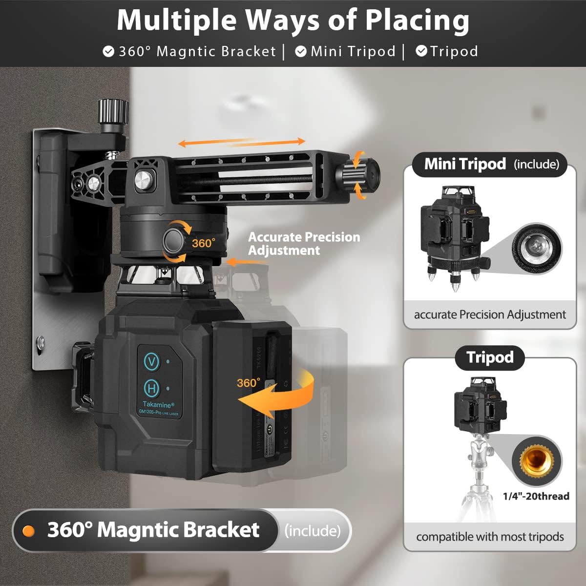 Ground/wall use and multiple installation methods: This line laser provides a 1/4" mounting thread for fixing on tripod or mounting pole. Equipped with 360°free rotating base, it can be rotated to desired angle. The base also has 1/4"-20 and 5/8"-11 mounting threads to adapt different tripod. It' equipped with a patented bracket that can be adjusted universally,which is currently the most adjustable in the market. It can be fixed to wall by magnetism or screws, so it can be used in more scenes