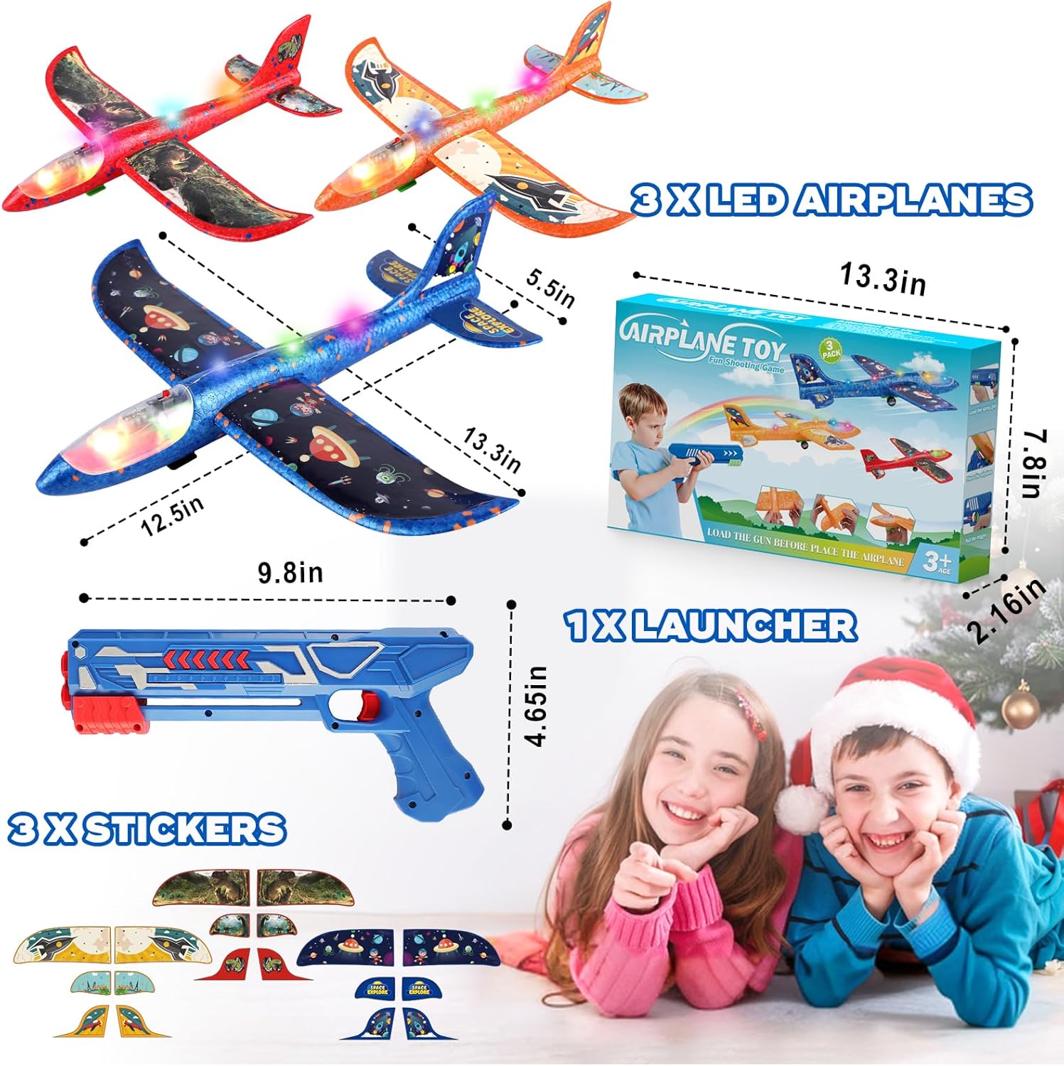 Gifts for boys girls: Package included: 1 x Launcher; 3 x LED Foam Airplanes; 3 x Stickers Theme of Rocket; Dinosaur; UFO; 1 x Use Manual. Perfect gift for kids 3 4 5 6 7 8 9 10 11 12 years old for birthday; Easter; Children's day; Halloween, Christmas