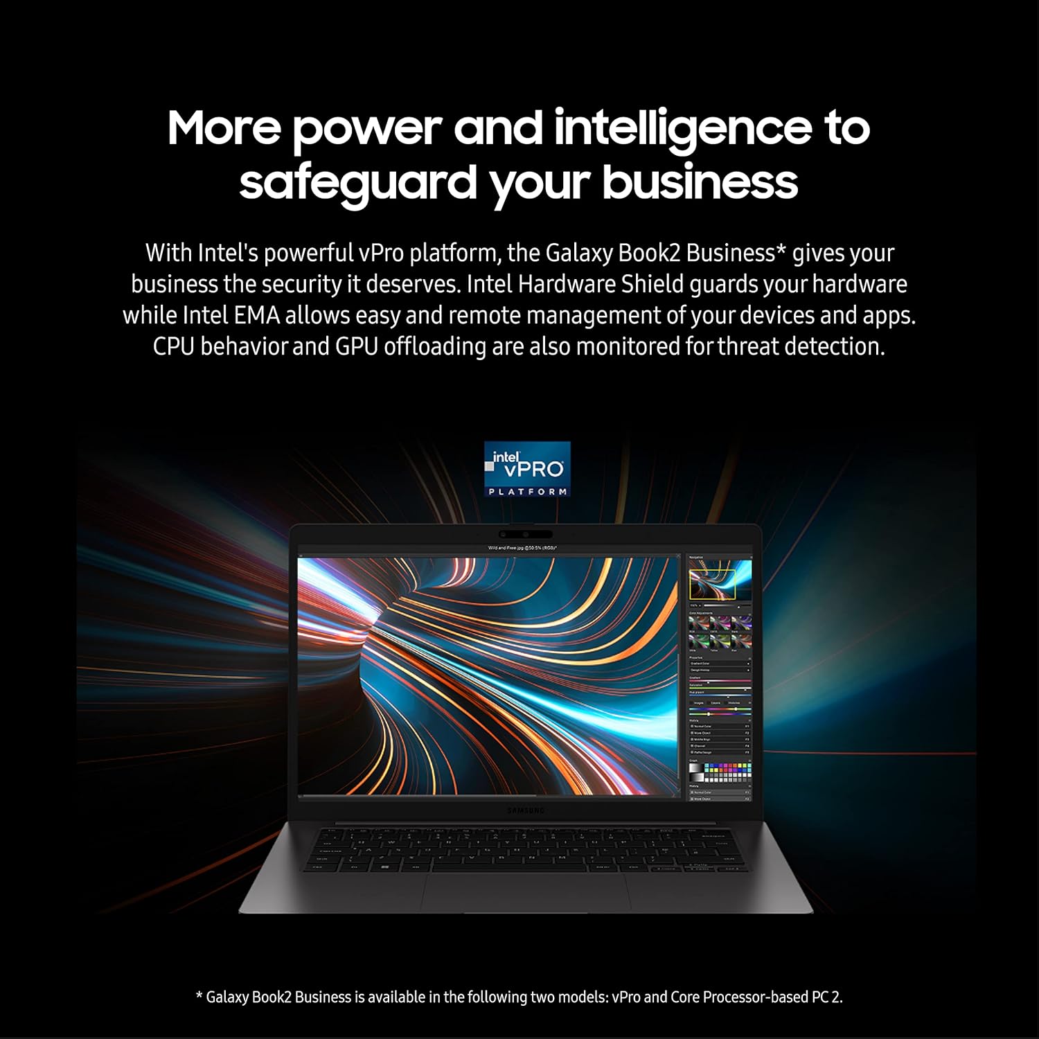 REMOTE COLLABORATION: Galaxy Book2 Business is the laptop for the hybrid working world; A premium video call experience, enhanced graphics and an anti-glare display** will help your team conquer each workday