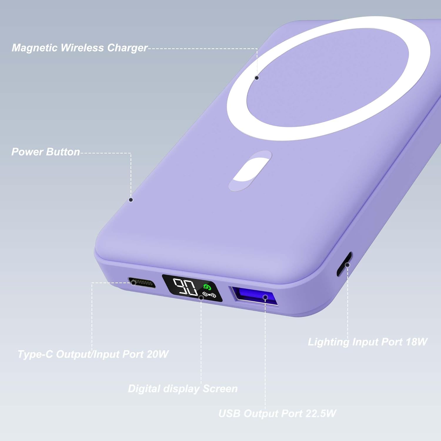Strong Magnetic & Fast Charging: MagSafe battery pack adopts the latest magnetic suction technology, charging immediately after contact. Support 5W, 7.5W, 10W, and 15W max wireless fast charging, also 22.5W max USB-A PD output, Max 20W USB-C output, 18W Lighting input fast charging, and max 18w USB-C input.