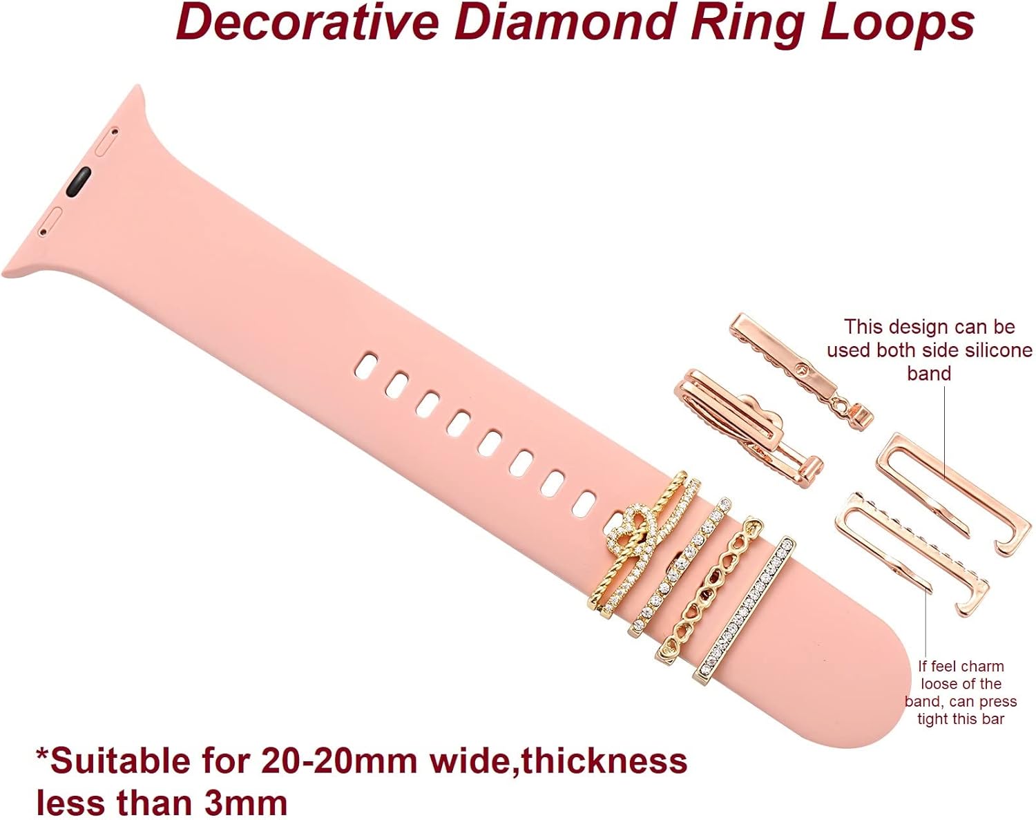 Good accessory: Wonderful cute charm loop for decorative your silicone or leather band, to make the band cute and special outlooking. Cute choice for Wedding,Birthday,New Year,Valentine’s Day,Christmas Day,Thanksgiving Day mother’s Day women’s Day Birthday for your girlfriend, wife .These diamond ring loops are a great addition to watch band.