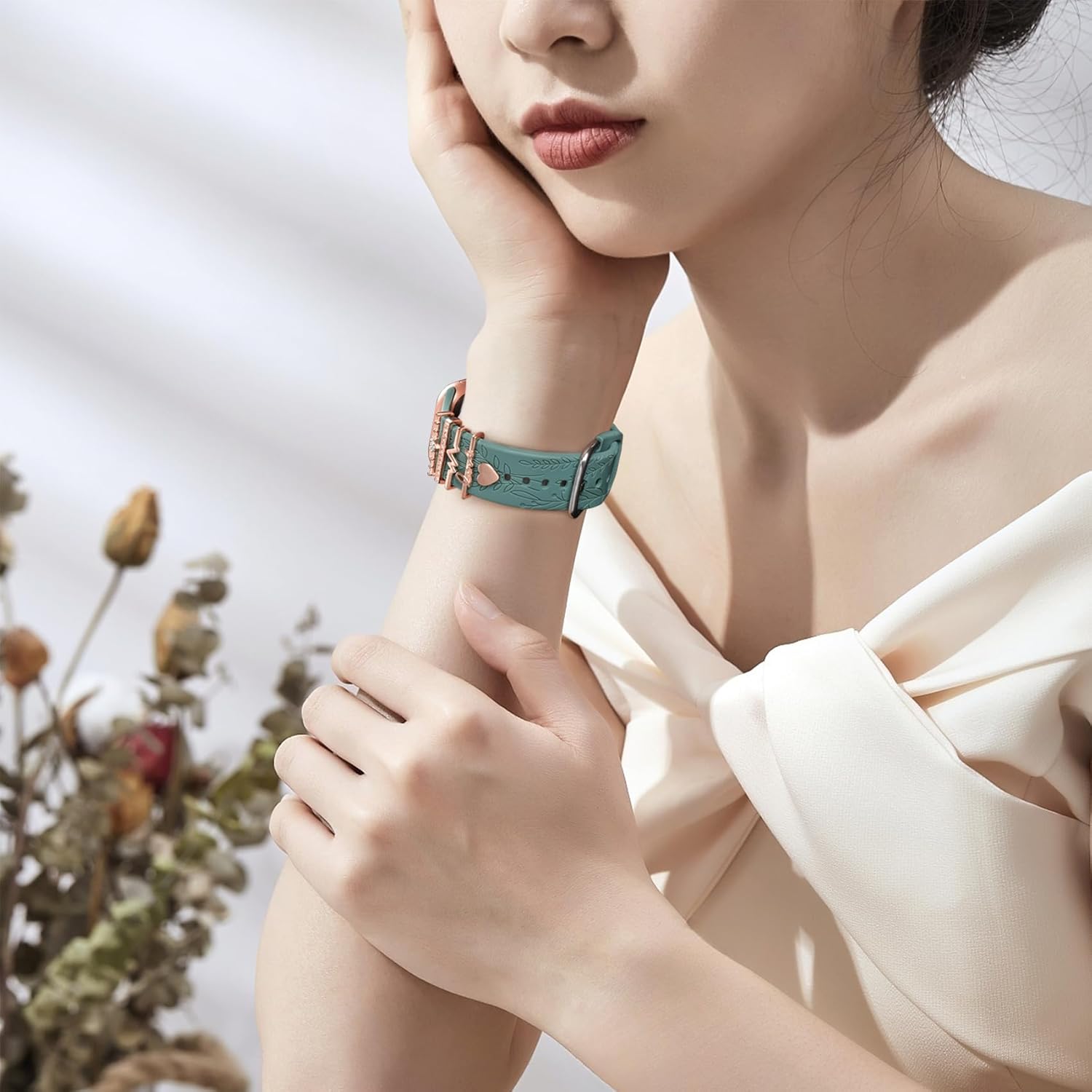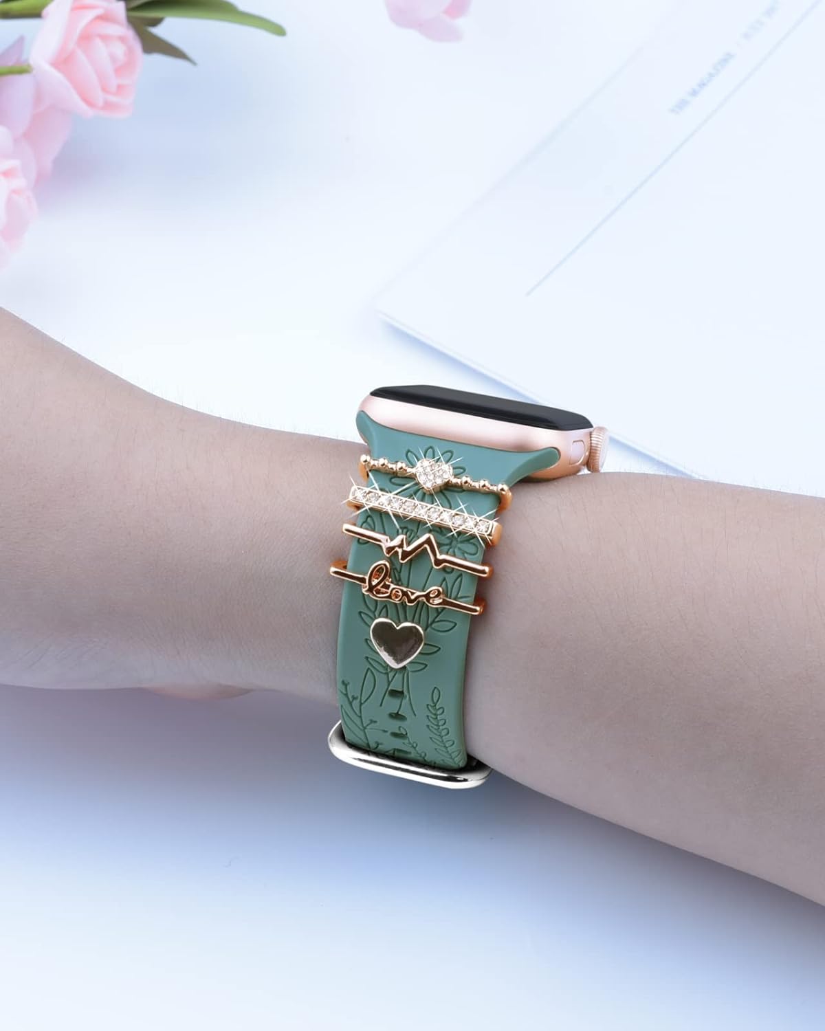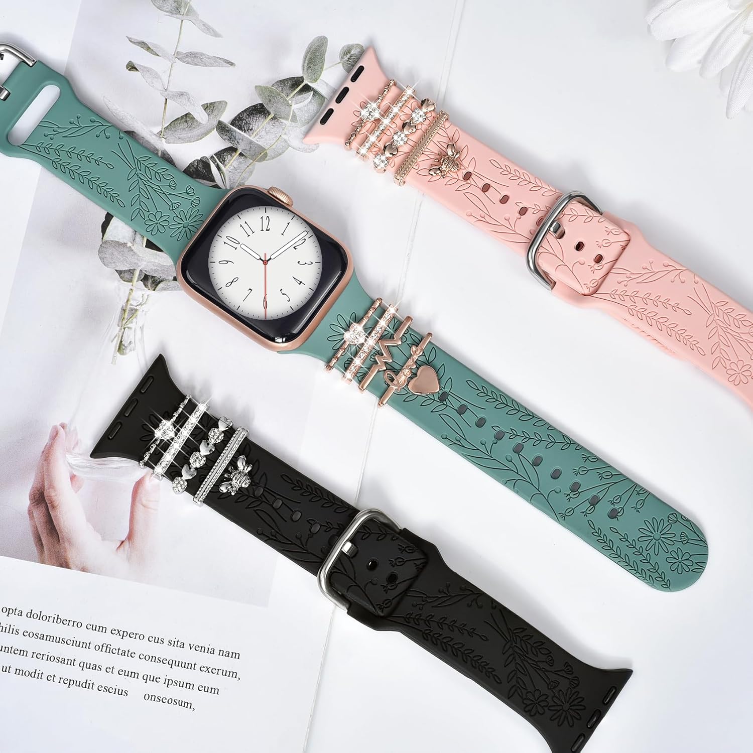 ORATYFAN Watch Band Charms (Band Included), Compatible with Apple Watch Band 38mm 40mm 41mm, Floral Engraved Silicone Stra...