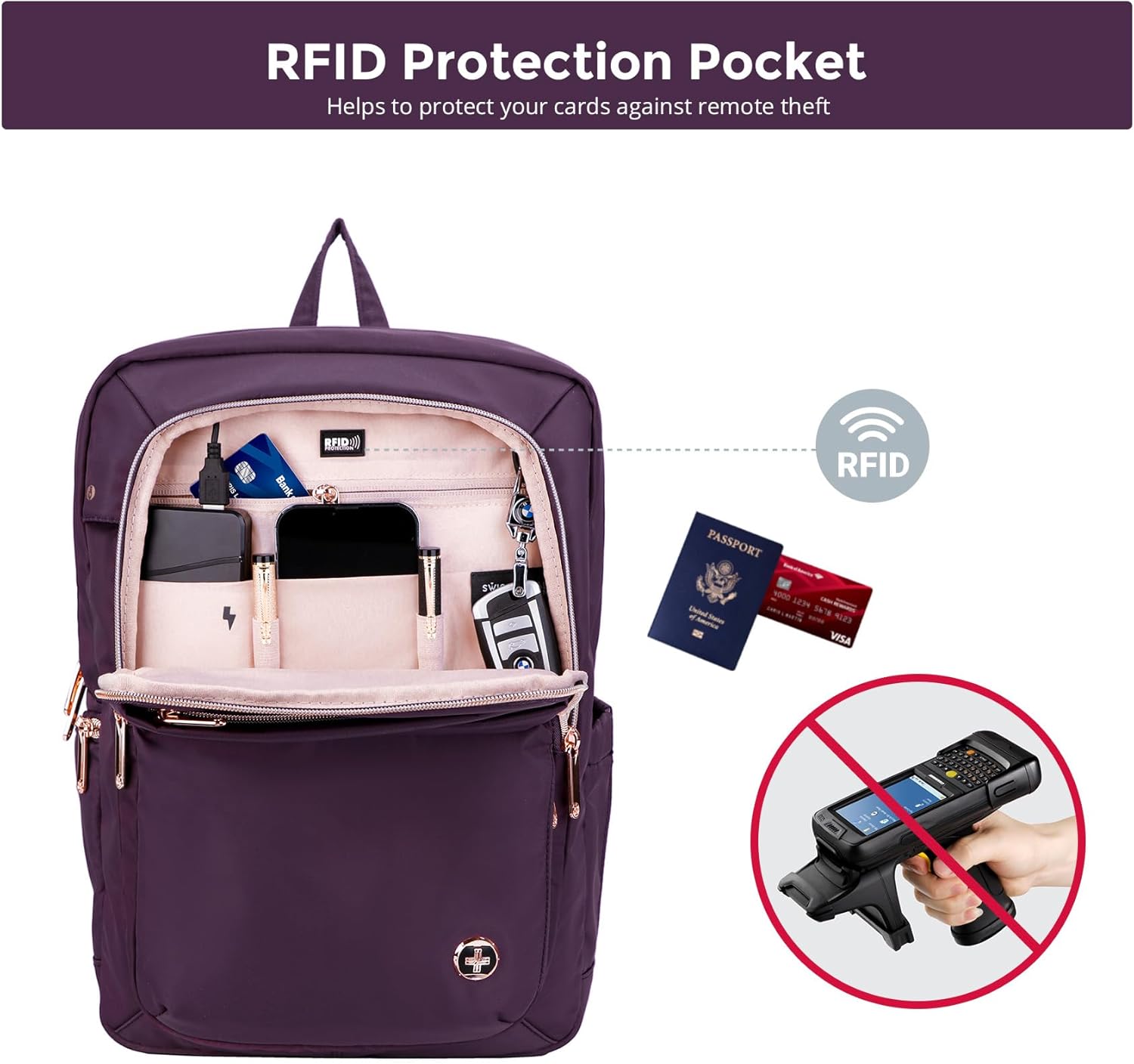 STYLISH PROTECTION: Women backpack made with high quality materials and Swiss Design to provide both style and protection for your belongings. The velvet lined sunglass pocket gives your sunglasses comfort and protection. An RFID pocket protects your credit cards, driver's licenese and passport from electronic snooping
