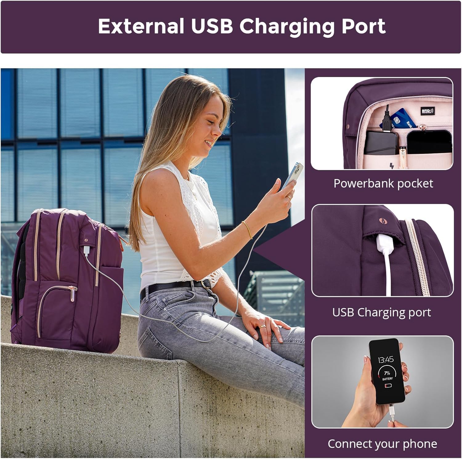 ALL DAY COMFORT: Adjustable padded straps provide the right women's computer backpack fit to give you comfort all day. The added USB Charging Port provides quick access to charge and use your phone and other USB devices while walking. (Battery Pack is not included). No specific battery packs required.Built-In Water Bottle holder provides you with easy storage to stay hydrated throughout your day