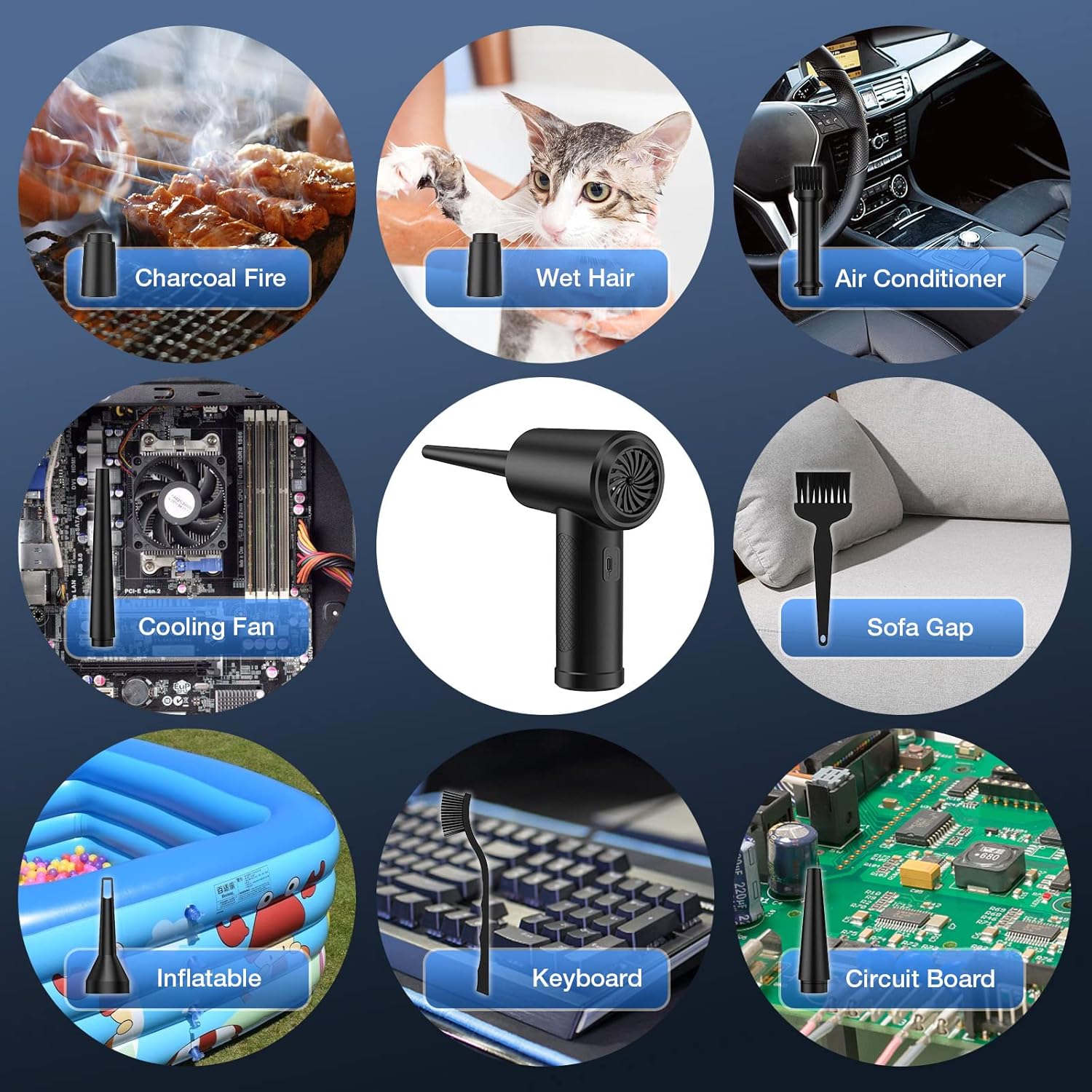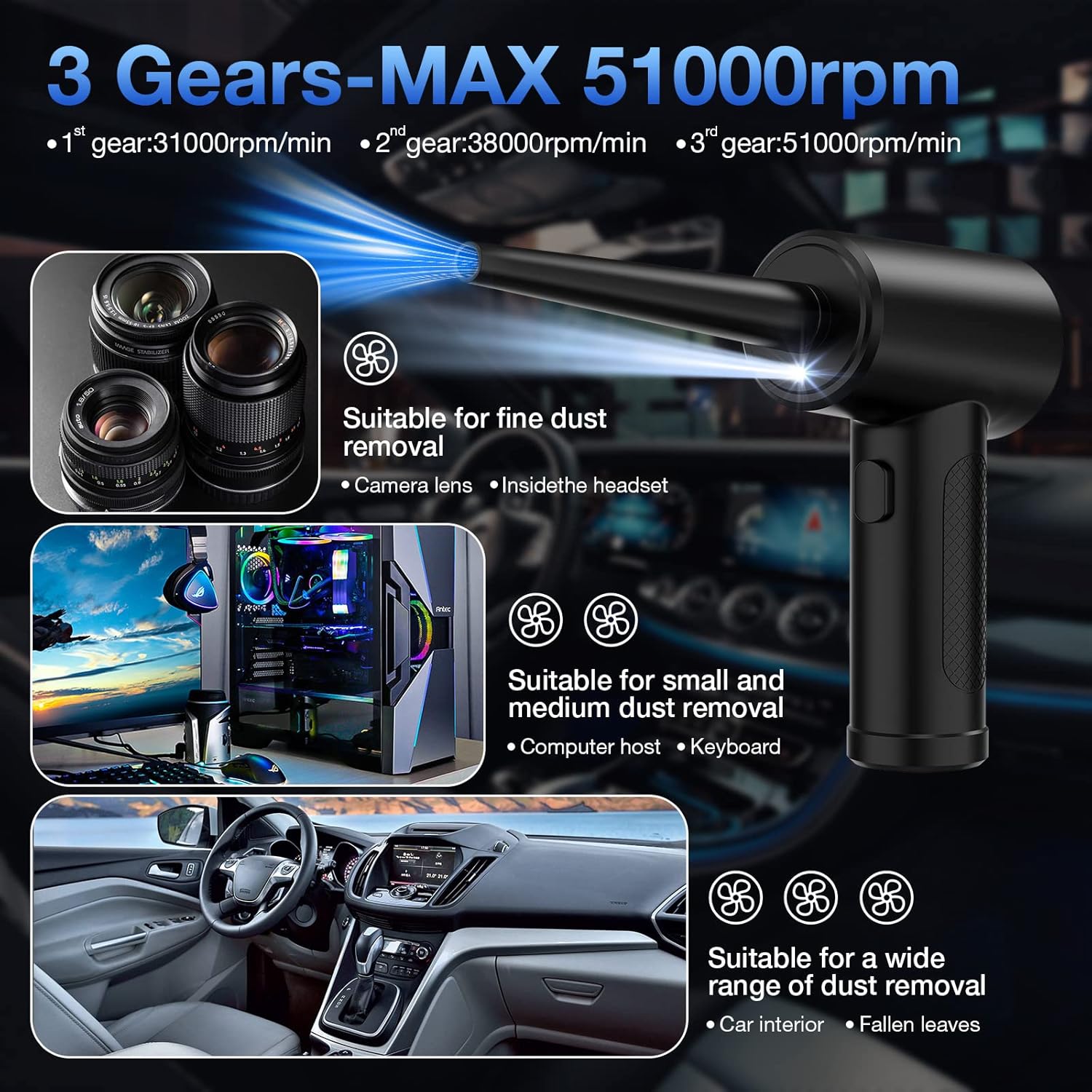 3-Speed Adjustable Power: Compressed air dusters are equipped with 3 gears of air speed, 31000-51000RPM speed selection, generating incredible airflow, Perfect replacement for compressed air cans. Great gift for family, friends, workman, mechanic.