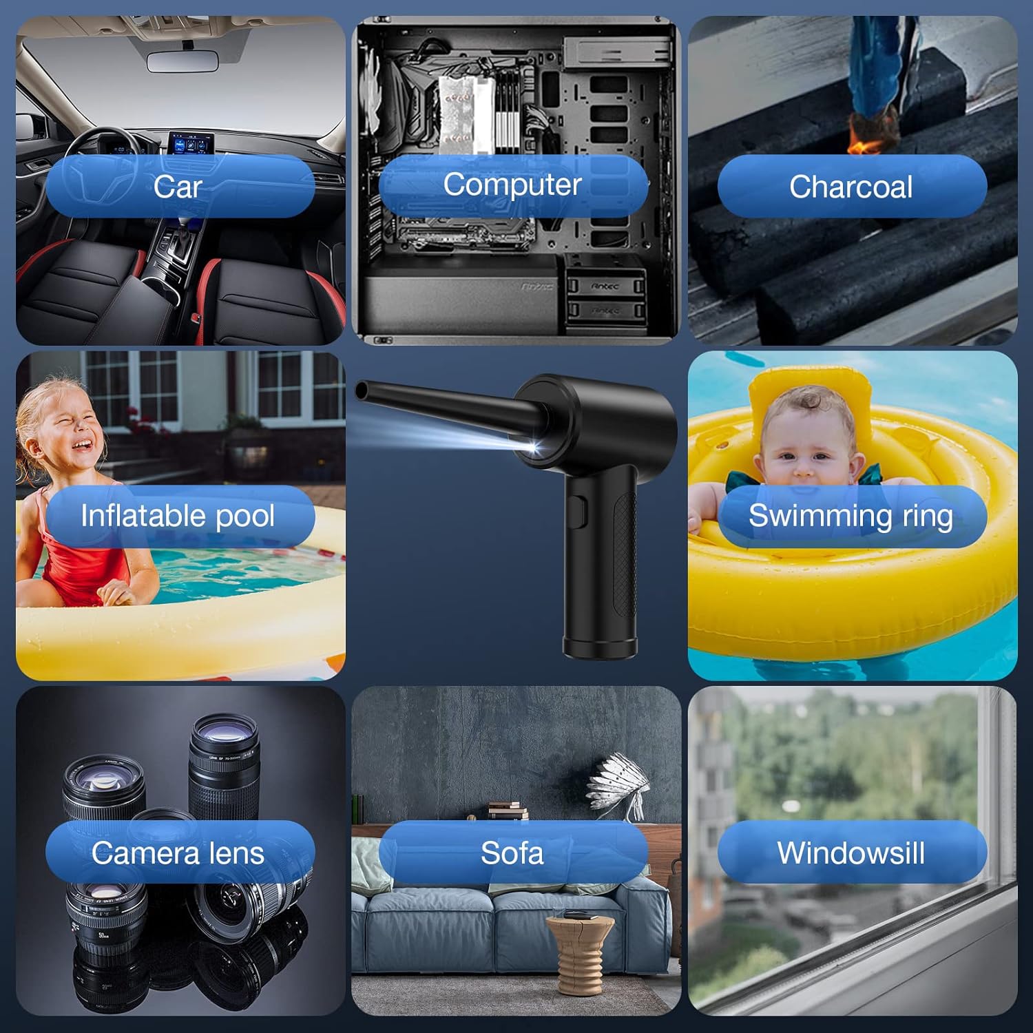 Humanized Design: Equipped with LED light, the air blower help you can see clearly to facilitate your cleaning in dark places or at night. The LED light will automatic lighting when power on, make Cleaning easier, It is definitely a great choice for household cleaning, industrial cleaning and car cleaning.