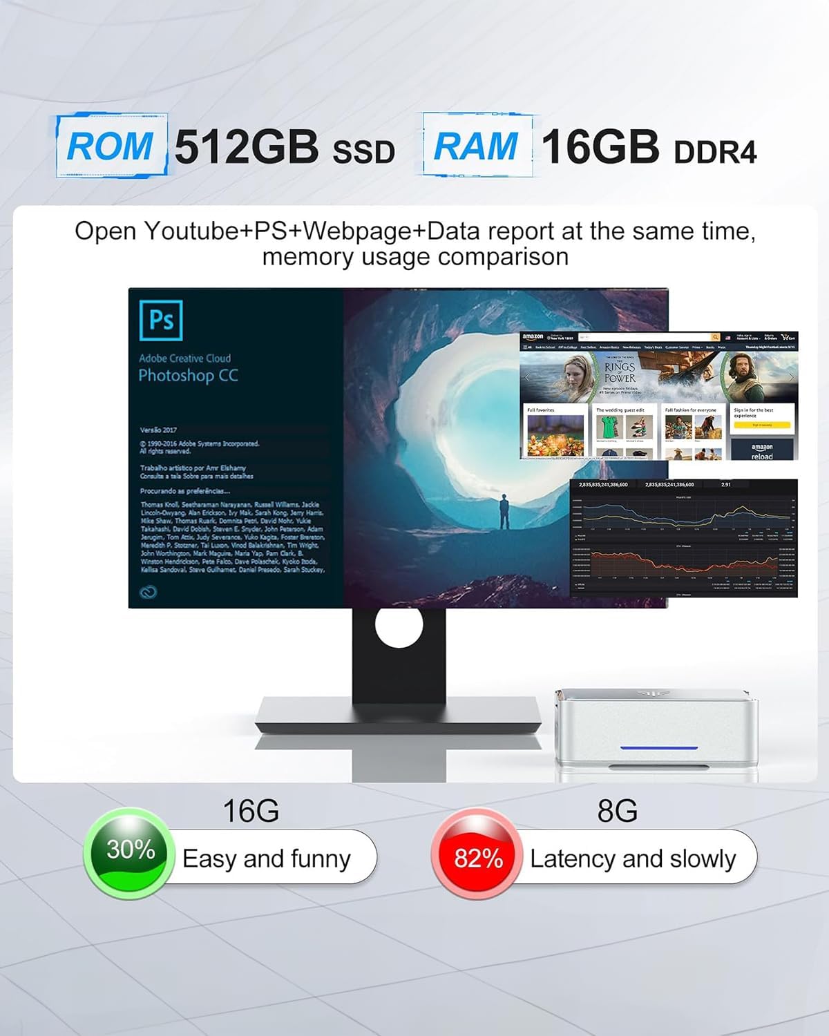 【16GB RAM 512GB SSD UP TO 2TB】--KAMRUI mini pc with high-speed 16GB DDR4, Built-in 512GB M.2 2280 SSD.16GB of RAM memory makes your entire system speedy and responsive. That way it can support tasks like memory-hogging multitab browsing and opening a huge graphic file quickly and easily. If you want more storage space, you can also add a 2.5"" SSD (no included) to expand the memory upgrade storage to 2TB to expand the memory wonderful safety data bank.