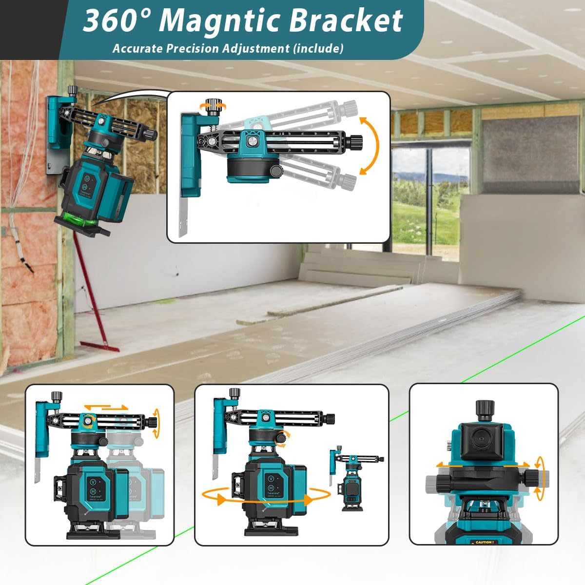 Ground/wall use and multiple installation methods: This line laser provides a 1/4" mounting thread for fixing on tripod or mounting pole. Equipped with 360° free rotating base, it can be rotated to desired angle. The base also has 1/4"-20 and 5/8"-11 mounting threads to adapt different tripod. It' equipped with a patented bracket that can be adjusted universally,which is currently the most adjustable in the market. It can be fixed to wall by magnetism or screws, so it can be used in more scenes