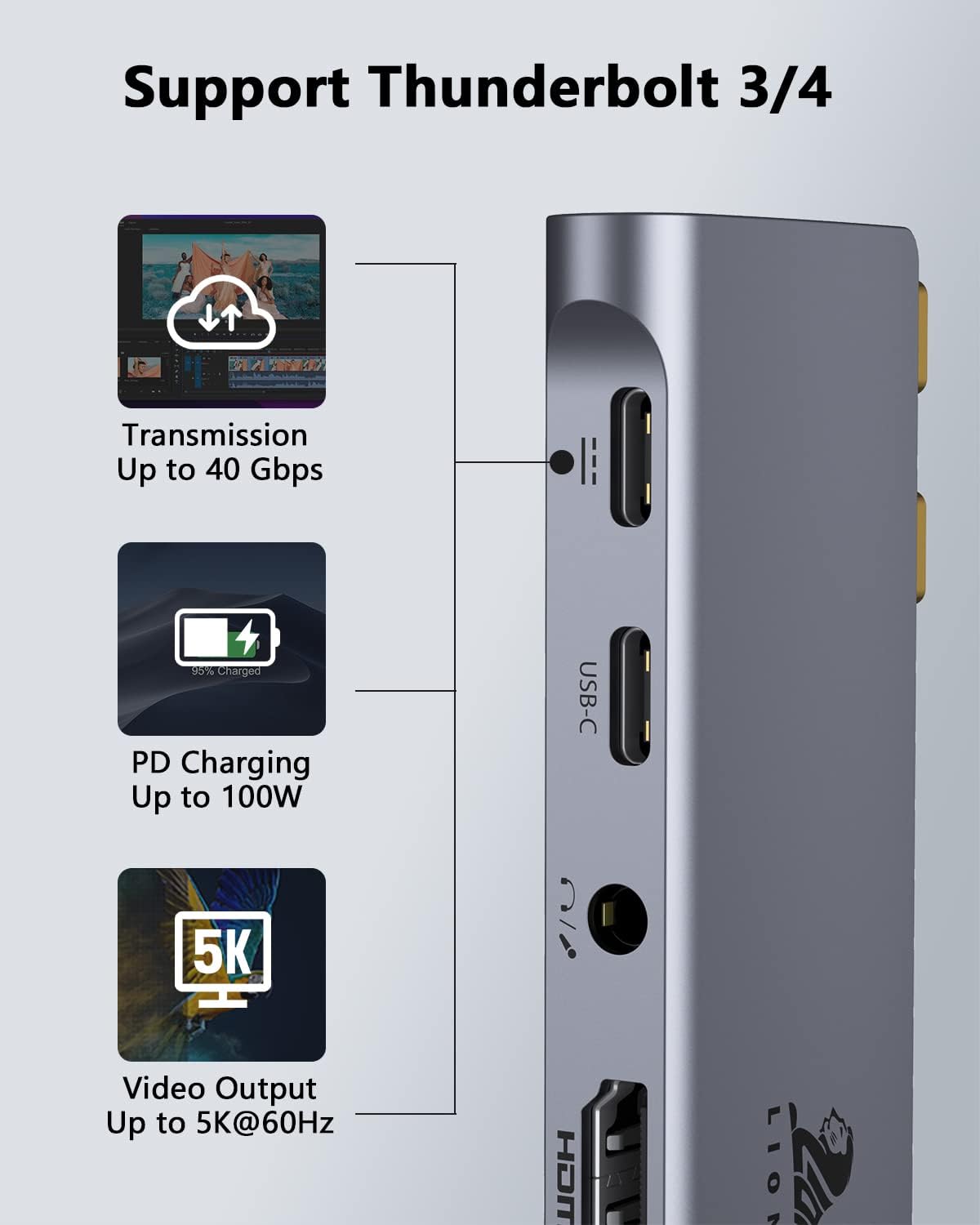 【A Multifunctional USB-C port compatible with Thunderbolt 3/4 】In this Macbook Pro dongle,one USB-C Port compatible with Thunderbolt 3/4 supports data transfer up to 40Gb/s, up to 5K displays, up to 100W power; It and HDMI port can be used simultaneously to support dual monitor display ,to mirror or extend your laptop's display to your TV, monitor or projector[Note: For M1M2M3 , this macbook accessories does not support dual display. Another usb c port is only for data transfer, speed usb 3.0 ]