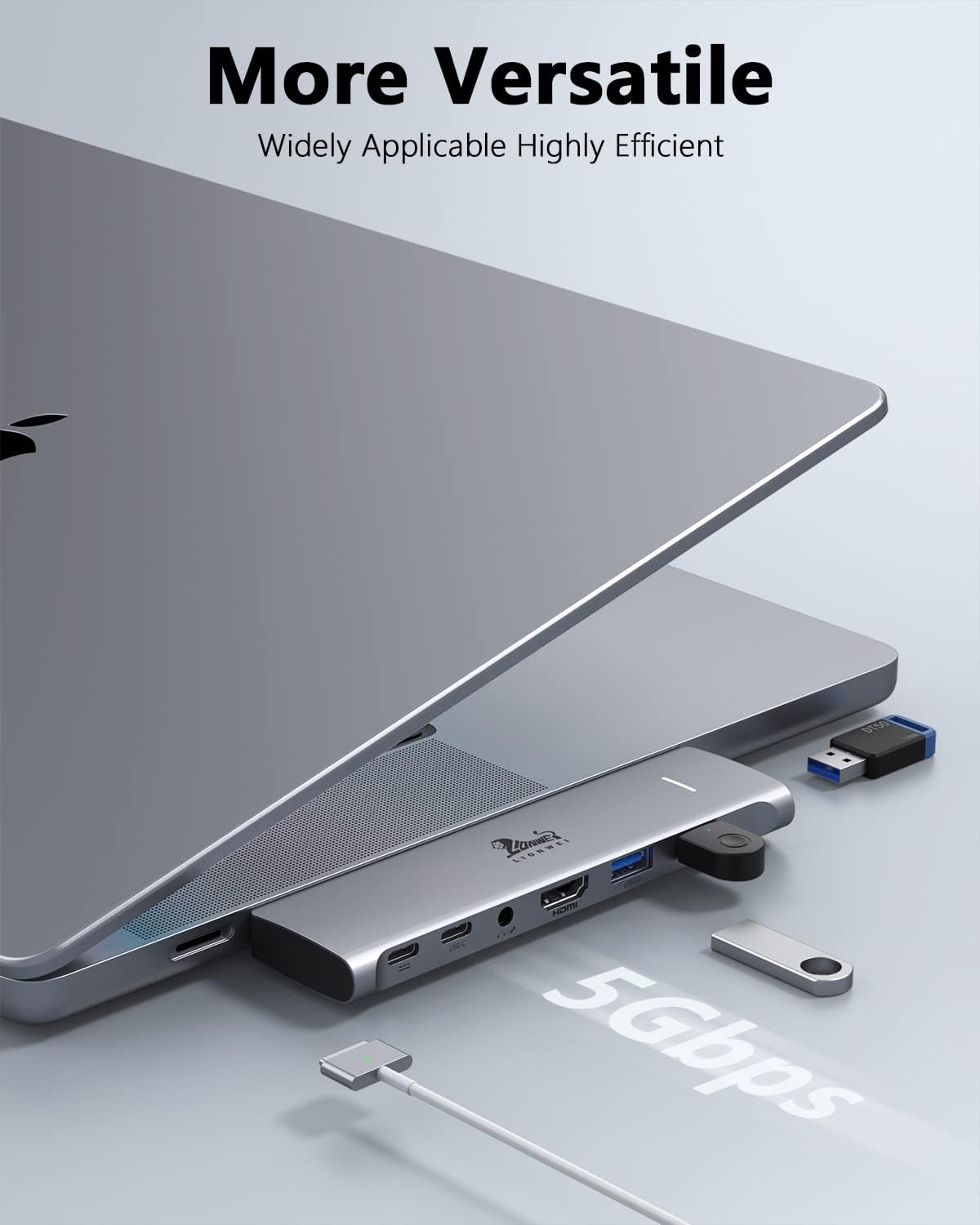【Newly upgraded 7-IN-2 Macbook Pro Multiport Adapter】Note:This Macbook Adapter compatible with the new MacBook with magnetic 3 charging, Not block the Magnetic suction charging port.It equipped with 1*4K30HZ HDMI port, 1* Thunderbolt-enabled USB-C port(support 100W PD charging / 40Gbps data transfer / 5K60HZ display), 3*USBA 3.0+1*USBC 3.0 ,1*MIC/3.5mm Audio; Perfect for MacBook Pro/Air 13''/15''/16''(2016-2022);Not suitable for the Macbook with protective case